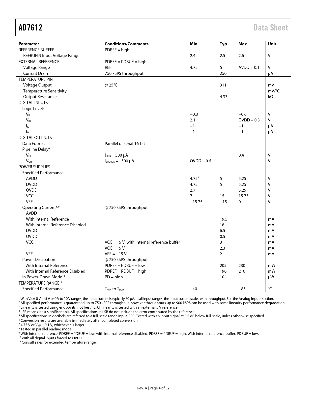 AD7612. Data Sheet. Parameter Conditions/Comments. Min. Typ. Max. Unit