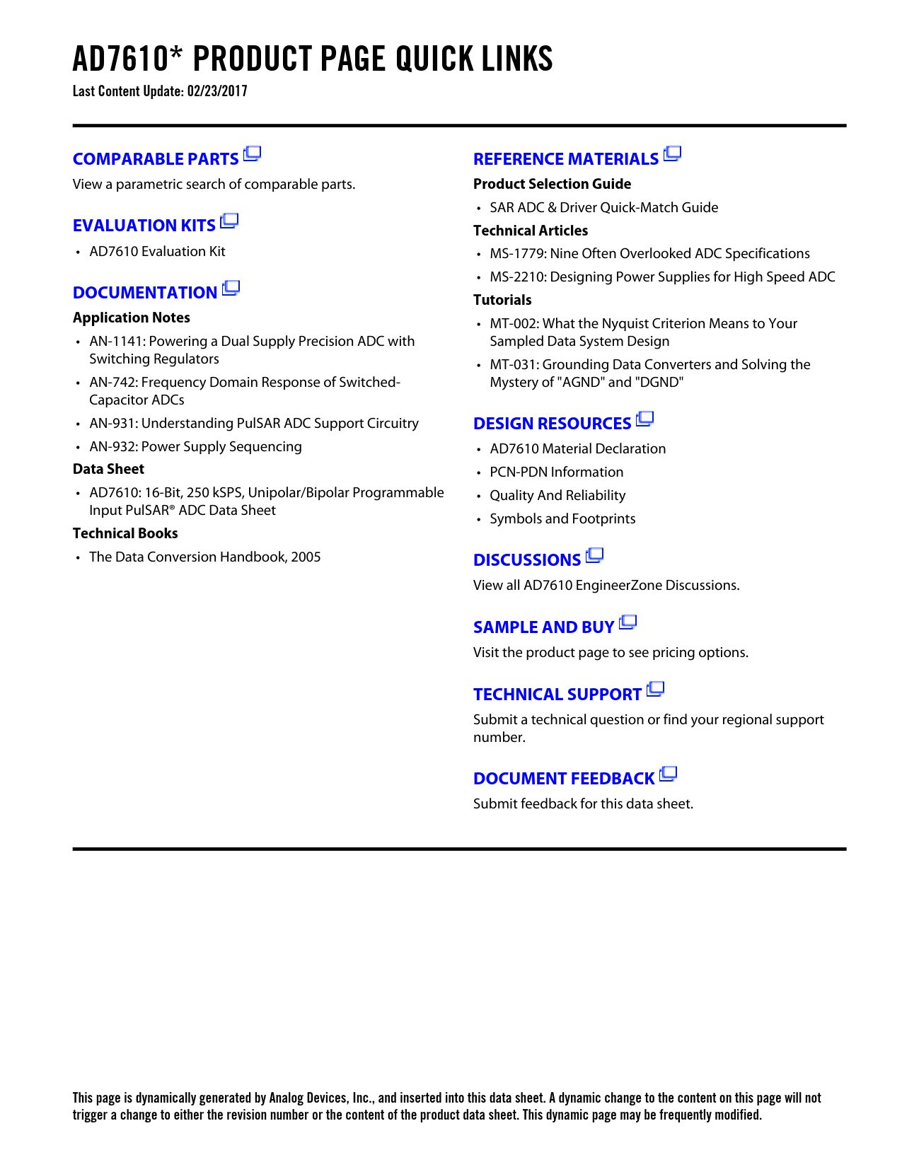This page is dynamically generated by Analog Devices, Inc., and inserted into this data sheet. A dynamic change to the content on this page will not trigger a change to either the revision number or the content of the product data sheet. This dynamic page may be frequently modified.