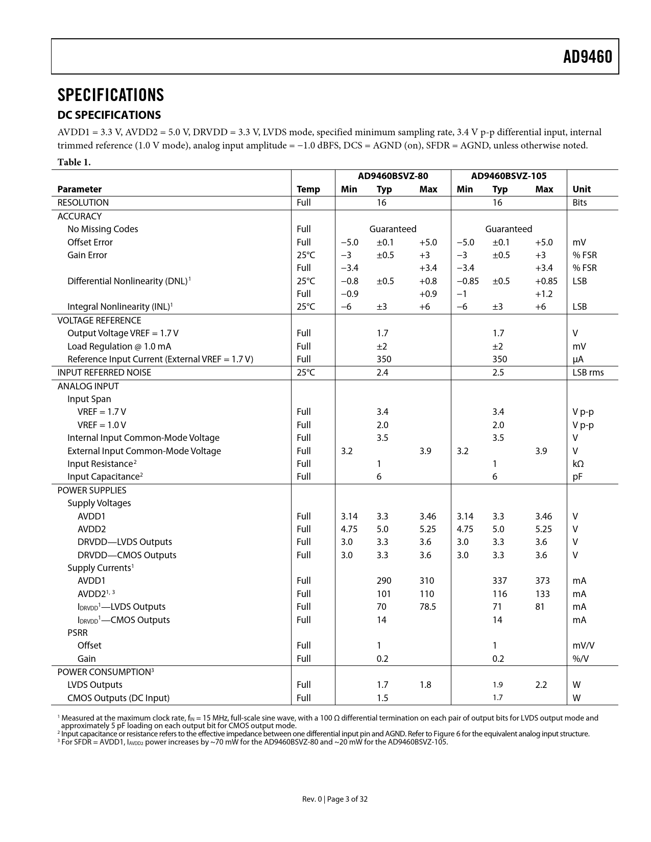 AD9460 SPECIFICATIONS DC SPECIFICATIONS Table 1 AD9460BSVZ-80 AD9460BSVZ-105 Parameter Temp Min Typ Max Min Typ Max Unit