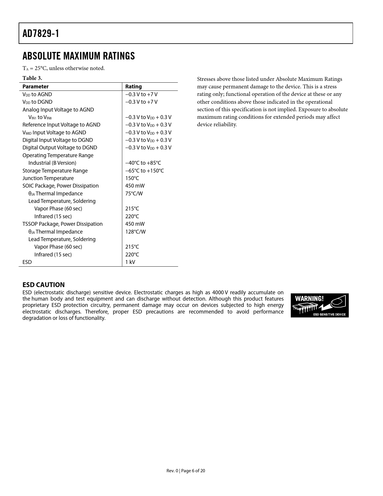 AD7829-1ABSOLUTE MAXIMUM RATINGS TA = 25°C, unless otherwise noted. Table 3. Stresses above those listed under Absolute Maximum Ratings Parameter Rating may cause permanent damage to the device. This is a stress VDD to AGND −0.3 V to +7 V rating only; functional operation of the device at these or any VDD to DGND −0.3 V to +7 V other conditions above those indicated in the operational Analog Input Voltage to AGND section of this specification is not implied. Exposure to absolute VIN1 to VIN8 −0.3 V to VDD + 0.3 V maximum rating conditions for extended periods may affect Reference Input Voltage to AGND −0.3 V to VDD + 0.3 V device reliability. VMID Input Voltage to AGND −0.3 V to VDD + 0.3 V Digital Input Voltage to DGND −0.3 V to VDD + 0.3 V Digital Output Voltage to DGND −0.3 V to VDD + 0.3 V Operating Temperature Range Industrial (B Version) −40°C to +85°C Storage Temperature Range −65°C to +150°C Junction Temperature 150°C SOIC Package, Power Dissipation 450 mW θJA Thermal Impedance 75°C/W Lead Temperature, Soldering Vapor Phase (60 sec) 215°C Infrared (15 sec) 220°C TSSOP Package, Power Dissipation 450 mW θJA Thermal Impedance 128°C/W Lead Temperature, Soldering Vapor Phase (60 sec) 215°C Infrared (15 sec) 220°C ESD 1 kV ESD CAUTION ESD (electrostatic discharge) sensitive device. Electrostatic charges as high as 4000 V readily accumulate on the human body and test equipment and can discharge without detection. Although this product features proprietary ESD protection circuitry, permanent damage may occur on devices subjected to high energy electrostatic discharges. Therefore, proper ESD precautions are recommended to avoid performance degradation or loss of functionality. Rev. 0 | Page 6 of 20 Document Outline FEATURES APPLICATIONS GENERAL DESCRIPTION FUNCTIONAL BLOCK DIAGRAM PRODUCT HIGHLIGHTS TABLE OF CONTENTS REVISION HISTORY SPECIFICATIONS TIMING CHARACTERISTICS TIMING DIAGRAM ABSOLUTE MAXIMUM RATINGS ESD CAUTION PIN CONFIGURATION AND FUNCTION DESCRIPTIONS TERMINOLOGY CIRCUIT INFORMATION CIRCUIT DESCRIPTION TYPICAL CONNECTION DIAGRAM ADC TRANSFER FUNCTION ANALOG INPUT POWER-UP TIMES POWER VS. THROUGHPUT OPERATING MODES PARALLEL INTERFACE MICROPROCESSOR INTERFACING AD7829-1 TO 8051 AD7829-1 TO PIC16C6x/PIC16C7x AD7829-1 TO ADSP-21xx INTERFACING MULTIPLEXER ADDRESS INPUTS OUTLINE DIMENSIONS ORDERING GUIDE