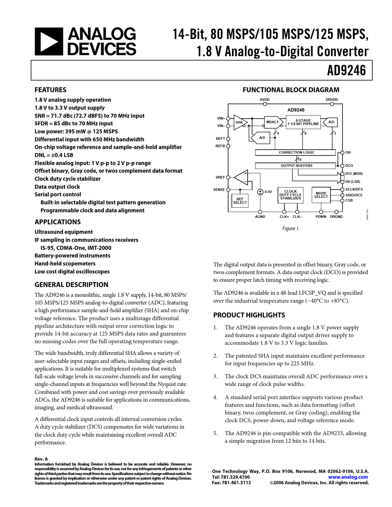 The AD9246 is a monolithic, single 1.8 V supply, 14-bit, 80 MSPS/ The AD9246 is available in a 48-lead LFCSP_VQ and is specified 105 MSPS/125 MSPS analog-to-digital converter (ADC), featuring over the industrial temperature range (−40°C to +85°C). a high performance sample-and-hold amplifier (SHA) and on-chip