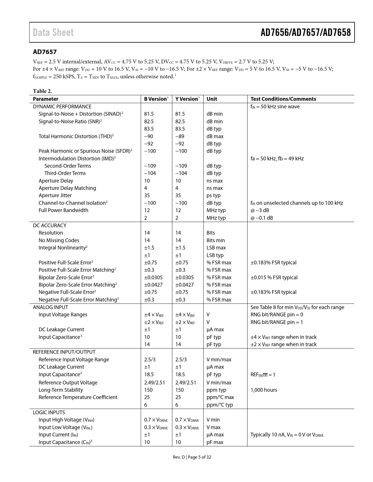 Páginas / Página32 / 5 — Data Sheet. AD7656/AD7657/AD7658. AD7657. Table 2. Parameter. B Version. …