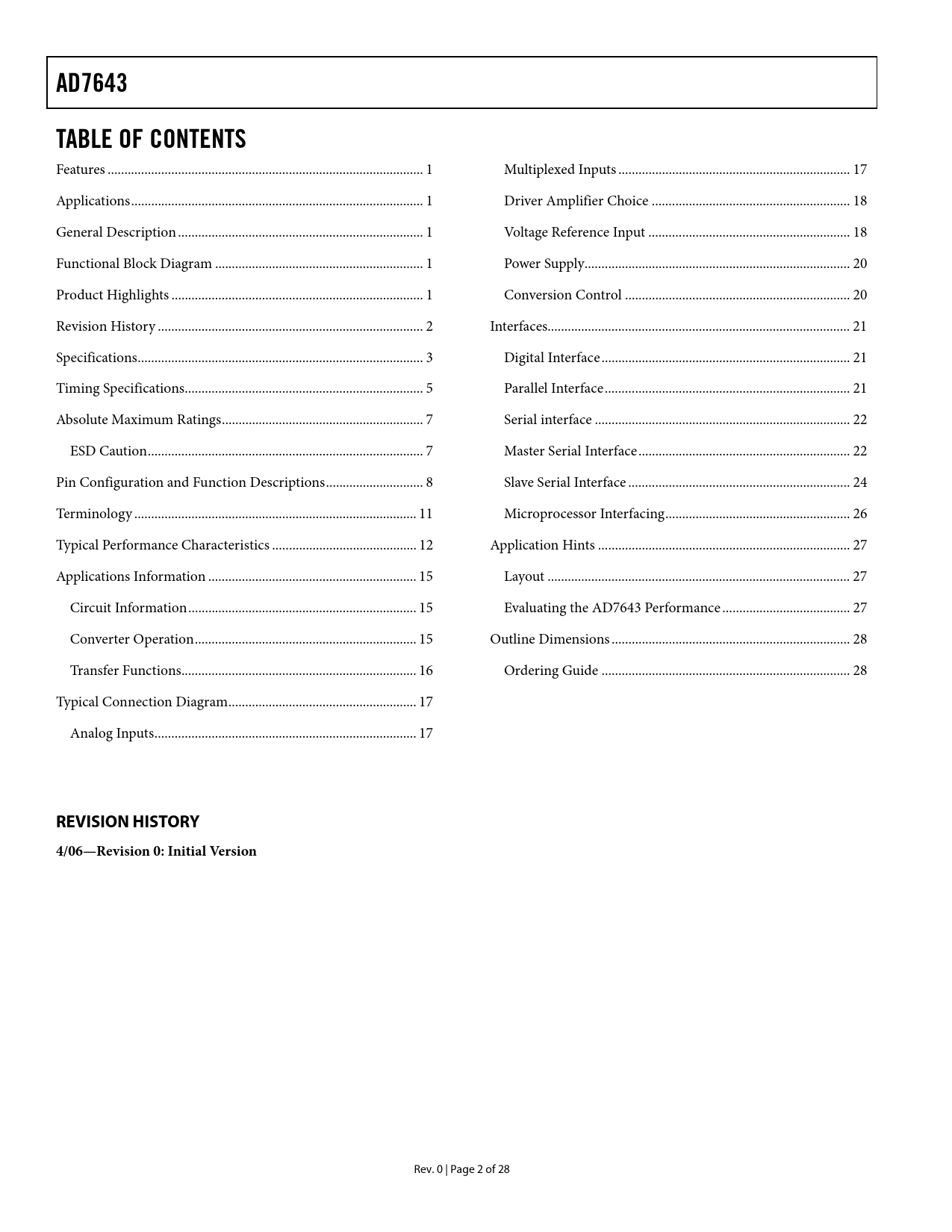 Páginas / Página29 / 3 — AD7643. TABLE OF CONTENTS. REVISION HISTORY. 4/06—Revision 0: Initial …