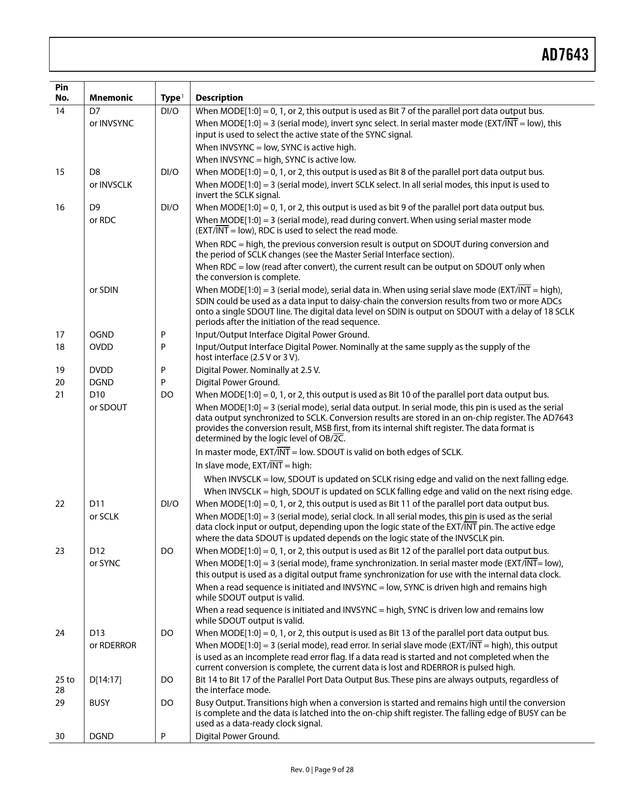 Páginas / Página29 / 10 — AD7643. Pin No. Mnemonic Type. Description