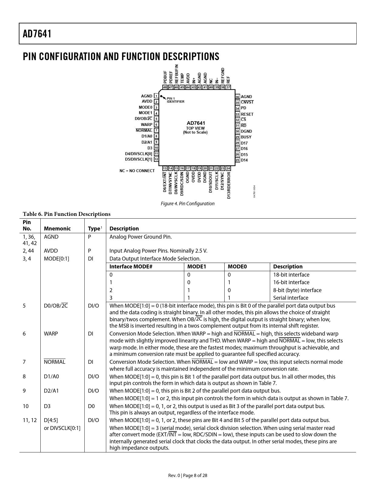 AD7641 PIN CONFIGURATION AND FUNCTION DESCRIPTIONS BUF DBUF DRE 48 47 46 45 44 43 42 41 40 39 38 37 AGND 1 36 AGND PIN 1 AVDD 2