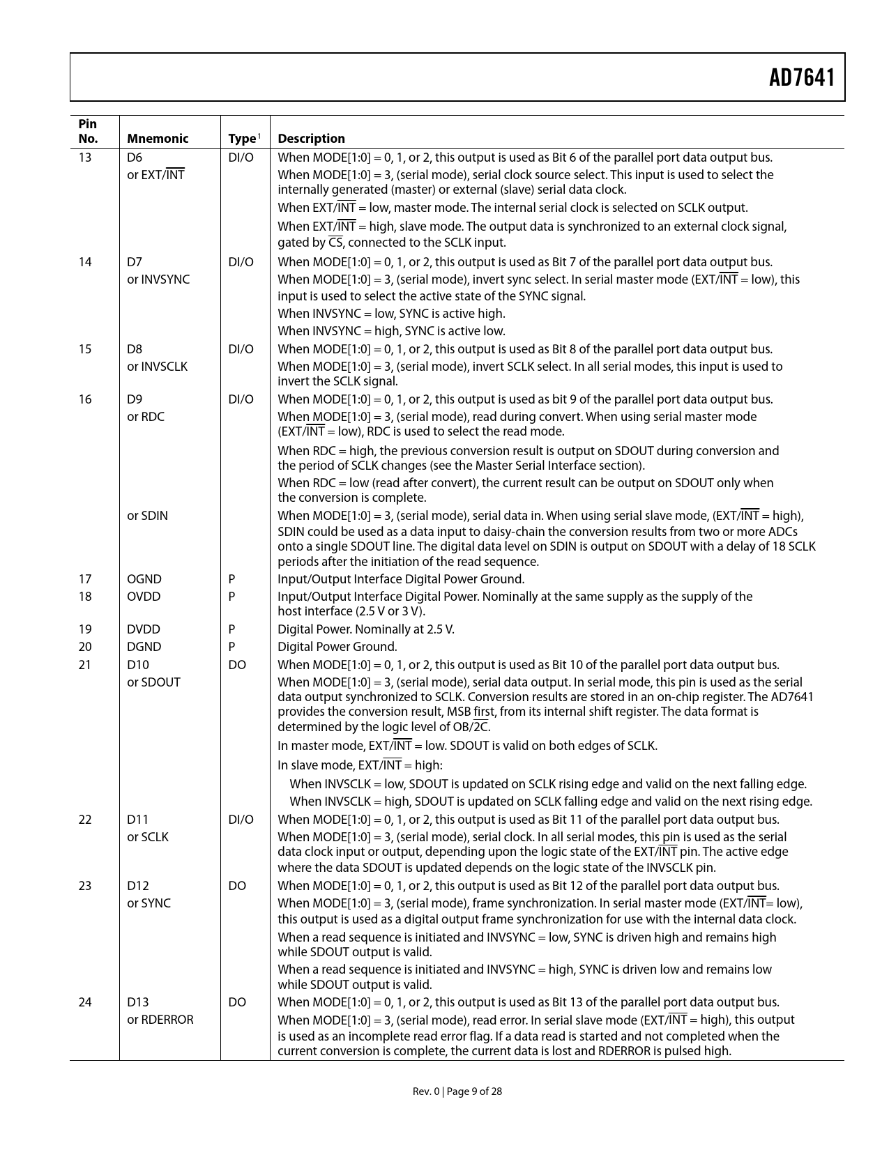 link to page 23 link to page 11 AD7641Pin No. Mnemonic Type 1 Description 13 D6 DI/O When MODE[1:0] = 0, 1, or 2, this output is used as Bit 6 of the parallel port data output bus. or EXT/INT When MODE[1:0] = 3, (serial mode), serial clock source select. This input is used to select the internally generated (master) or external (slave) serial data clock. When EXT/INT = low, master mode. The internal serial clock is selected on SCLK output. When EXT/INT = high, slave mode. The output data is synchronized to an external clock signal, gated by CS, connected to the SCLK input. 14 D7 DI/O When MODE[1:0] = 0, 1, or 2, this output is used as Bit 7 of the parallel port data output bus. or INVSYNC When MODE[1:0] = 3, (serial mode), invert sync select. In serial master mode (EXT/INT = low), this input is used to select the active state of the SYNC signal. When INVSYNC = low, SYNC is active high. When INVSYNC = high, SYNC is active low. 15 D8 DI/O When MODE[1:0] = 0, 1, or 2, this output is used as Bit 8 of the parallel port data output bus. or INVSCLK When MODE[1:0] = 3, (serial mode), invert SCLK select. In all serial modes, this input is used to invert the SCLK signal. 16 D9 DI/O When MODE[1:0] = 0, 1, or 2, this output is used as bit 9 of the parallel port data output bus. or RDC When MODE[1:0] = 3, (serial mode), read during convert. When using serial master mode (EXT/INT = low), RDC is used to select the read mode. When RDC = high, the previous conversion result is output on SDOUT during conversion and the period of SCLK changes (see the Master Serial Interface section). When RDC = low (read after convert), the current result can be output on SDOUT only when the conversion is complete. or SDIN When MODE[1:0] = 3, (serial mode), serial data in. When using serial slave mode, (EXT/INT = high), SDIN could be used as a data input to daisy-chain the conversion results from two or more ADCs onto a single SDOUT line. The digital data level on SDIN is output on SDOUT with a delay of 18 SCLK periods after the initiation of the read sequence. 17 OGND P Input/Output Interface Digital Power Ground. 18 OVDD P Input/Output Interface Digital Power. Nominally at the same supply as the supply of the host interface (2.5 V or 3 V). 19 DVDD P Digital Power. Nominally at 2.5 V. 20 DGND P Digital Power Ground. 21 D10 DO When MODE[1:0] = 0, 1, or 2, this output is used as Bit 10 of the parallel port data output bus. or SDOUT When MODE[1:0] = 3, (serial mode), serial data output. In serial mode, this pin is used as the serial data output synchronized to SCLK. Conversion results are stored in an on-chip register. The AD7641 provides the conversion result, MSB first, from its internal shift register. The data format is determined by the logic level of OB/2C. In master mode, EXT/INT = low. SDOUT is valid on both edges of SCLK. In slave mode, EXT/INT = high: When INVSCLK = low, SDOUT is updated on SCLK rising edge and valid on the next falling edge. When INVSCLK = high, SDOUT is updated on SCLK falling edge and valid on the next rising edge. 22 D11 DI/O When MODE[1:0] = 0, 1, or 2, this output is used as Bit 11 of the parallel port data output bus. or SCLK When MODE[1:0] = 3, (serial mode), serial clock. In all serial modes, this pin is used as the serial data clock input or output, depending upon the logic state of the EXT/INT pin. The active edge where the data SDOUT is updated depends on the logic state of the INVSCLK pin. 23 D12 DO When MODE[1:0] = 0, 1, or 2, this output is used as Bit 12 of the parallel port data output bus. or SYNC When MODE[1:0] = 3, (serial mode), frame synchronization. In serial master mode (EXT/INT= low), this output is used as a digital output frame synchronization for use with the internal data clock. When a read sequence is initiated and INVSYNC = low, SYNC is driven high and remains high while SDOUT output is valid. When a read sequence is initiated and INVSYNC = high, SYNC is driven low and remains low while SDOUT output is valid. 24 D13 DO When MODE[1:0] = 0, 1, or 2, this output is used as Bit 13 of the parallel port data output bus. or RDERROR When MODE[1:0] = 3, (serial mode), read error. In serial slave mode (EXT/INT = high), this output is used as an incomplete read error flag. If a data read is started and not completed when the current conversion is complete, the current data is lost and RDERROR is pulsed high. Rev. 0 | Page 9 of 28 Document Outline FEATURES APPLICATIONS GENERAL DESCRIPTION FUNCTIONAL BLOCK DIAGRAM PRODUCT HIGHLIGHTS TABLE OF CONTENTS REVISION HISTORY SPECIFICATIONS TIMING SPECIFICATIONS ABSOLUTE MAXIMUM RATINGS ESD CAUTION PIN CONFIGURATION AND FUNCTION DESCRIPTIONS TERMINOLOGY TYPICAL PERFORMANCE CHARACTERISTICS APPPLICATIONS INFORMATION CIRCUIT INFORMATION CONVERTER OPERATION MODES OF OPERATION TRANSFER FUNCTIONS TYPICAL CONNECTION DIAGRAM ANALOG INPUTS MULTIPLEXED INPUTS DRIVER AMPLIFIER CHOICE Single-to-Differential Driver VOLTAGE REFERENCE INPUT Internal Reference (PDBUF = Low, PDREF = Low) External 1.2 V Reference and Internal Buffer (PDBUF = Low, PDREF = High) External 2.5 V Reference (PDBUF = High, PDREF = High) Reference Decoupling Temperature Sensor POWER SUPPLY Power Sequencing Power-Up CONVERSION CONTROL INTERFACES DIGITAL INTERFACE RESET PARALLEL INTERFACE Master Parallel Interface Slave Parallel Interface 16-Bit and 8-Bit Interface (Master or Slave) SERIAL INTERFACE MASTER SERIAL INTERFACE Internal Clock SLAVE SERIAL INTERFACE External Clock External Discontinuous Clock Data Read After Conversion External Clock Data Read During Previous Conversion MICROPROCESSOR INTERFACING SPI Interface (ADSP-219x) APPLICATION HINTS LAYOUT EVALUATING THE AD7641 PERFORMANCE OUTLINE DIMENSIONS ORDERING GUIDE
