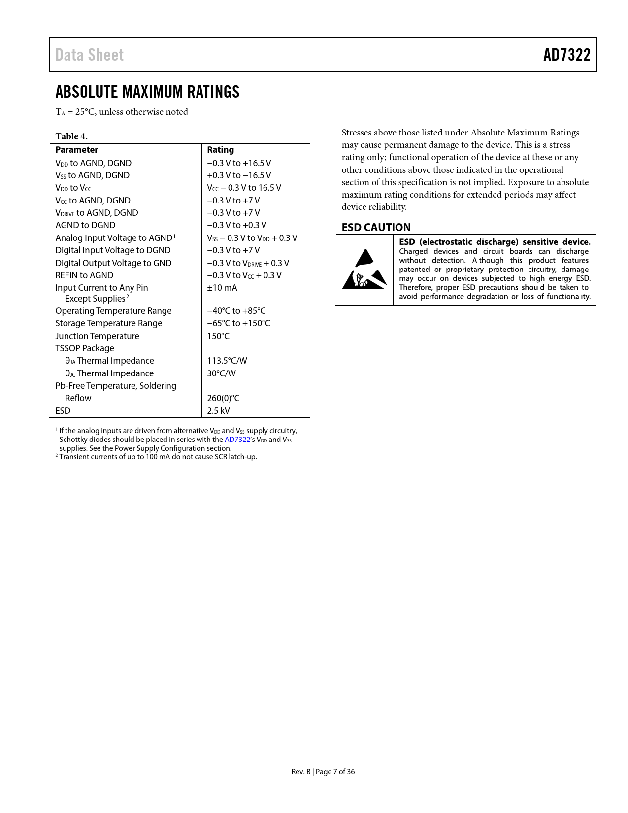 Data Sheet. AD7322. ABSOLUTE MAXIMUM RATINGS. Table 4. Parameter. Rating. ESD CAUTION
