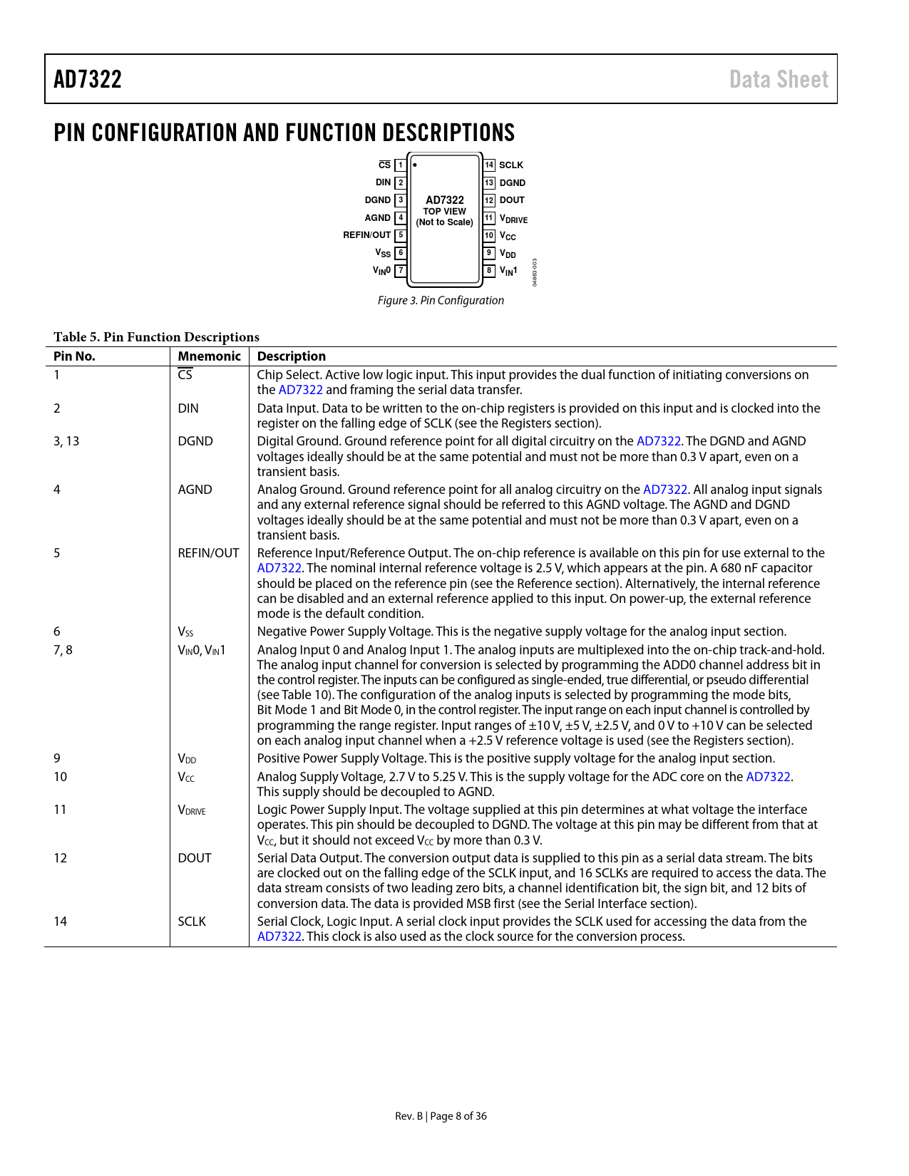 AD7322. Data Sheet. PIN CONFIGURATION AND FUNCTION DESCRIPTIONS. CS 1. 14 SCLK. DIN 2. 13 DGND. DGND 3. 12 DOUT. TOP VIEW. AGND 4. 11 VDRIVE