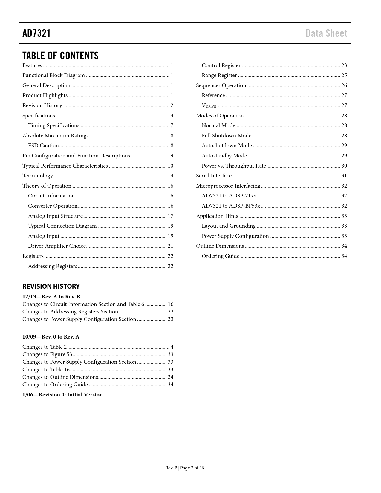 Rev. B | Page 2 of 36 Document Outline Features Functional Block Diagram General Description Product Highlights Table of Contents Revision History Specifications Timing Specifications Absolute Maximum Ratings ESD Caution Pin Configuration and Function Descriptions Typical Performance Characteristics Terminology Theory of Operation Circuit Information Converter Operation Output Coding Transfer Functions Analog Input Structure Track-and-Hold Section Typical Connection Diagram Analog Input Single-Ended Inputs True Differential Mode Pseudo Differential Inputs Driver Amplifier Choice Registers Addressing Registers Control Register Range Register Sequencer Operation Reference VDRIVE Modes of Operation Normal Mode Full Shutdown Mode Autoshutdown Mode Autostandby Mode Power vs. Throughput Rate Serial Interface Microprocessor Interfacing AD7321 to ADSP-21xx AD7321 to ADSP-BF53x Application Hints Layout and Grounding Power Supply Configuration Outline Dimensions Ordering Guide