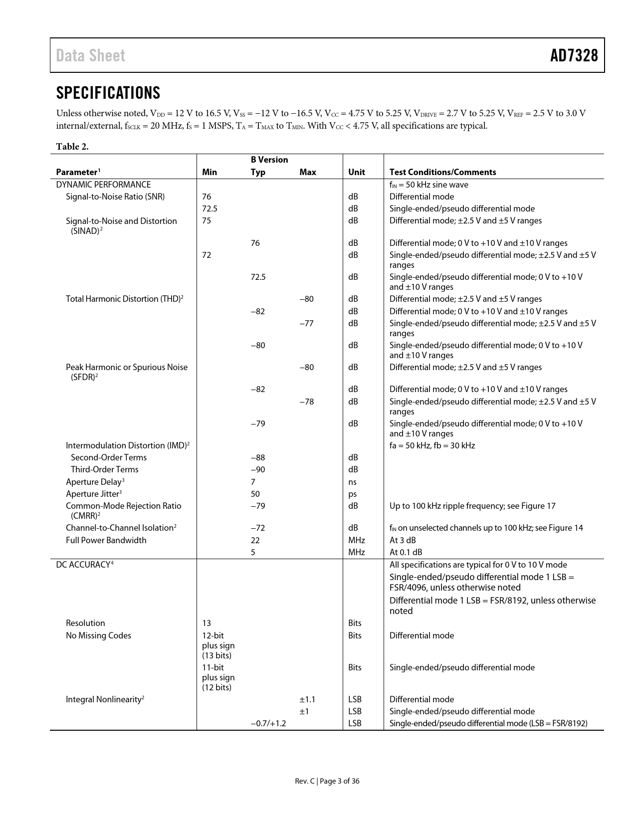 Data Sheet AD7328 SPECIFICATIONS Table 2 B Version Parameter1 Min Typ Max Unit Test Conditions/Comments