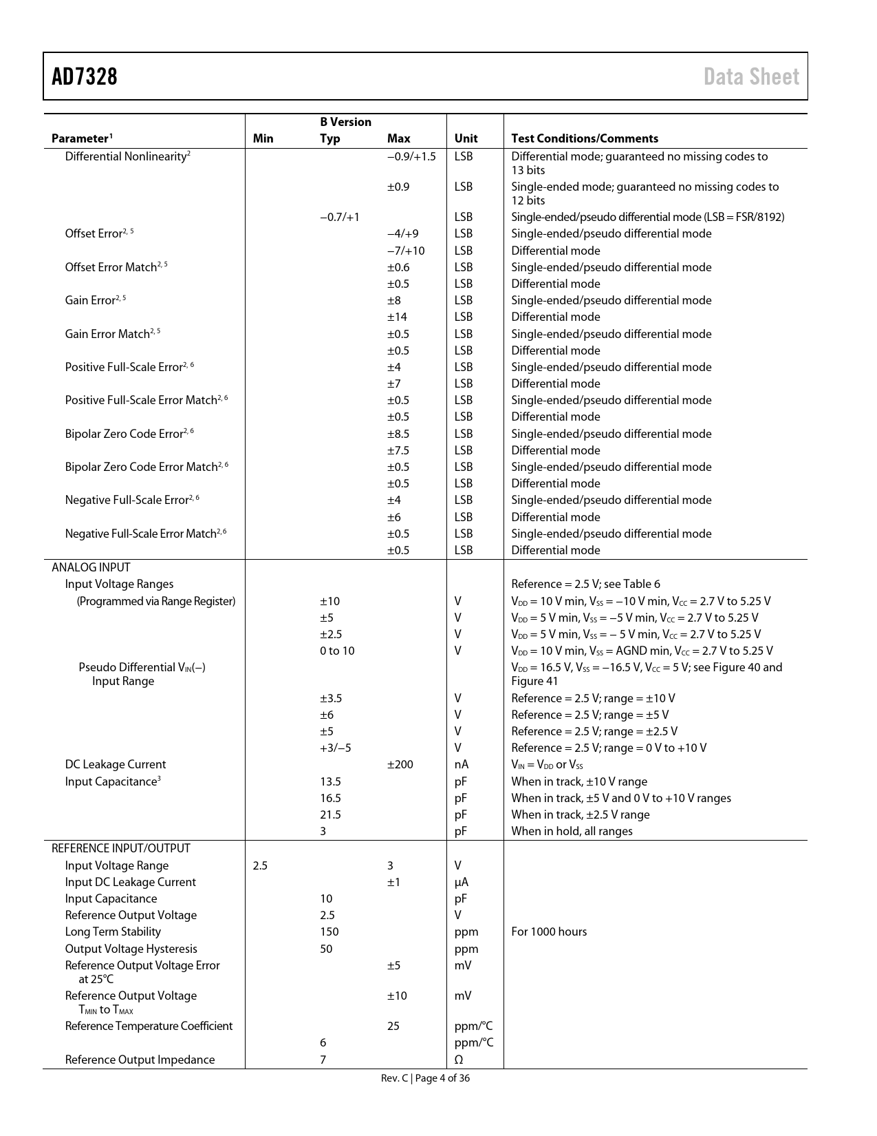 AD7328 Data Sheet B Version Parameter1 Min Typ Max Unit Test Conditions/Comments