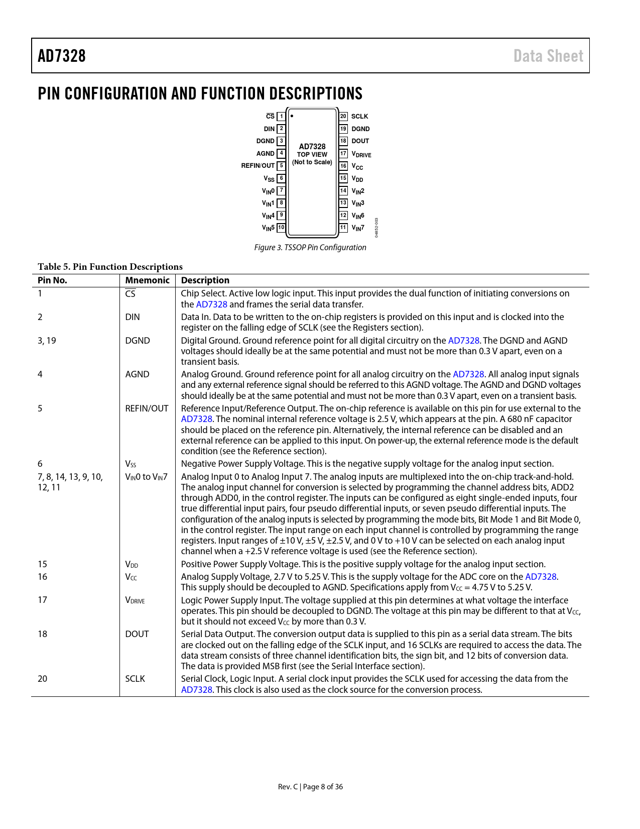 1 CS Chip Select. Active low logic input. This input provides the dual function of initiating conversions on the AD7328 and frames the serial data transfer. 2 DIN Data In. Data to be written to the on-chip registers is provided on this input and is clocked into the register on the falling edge of SCLK (see the Registers section). 3, 19 DGND Digital Ground. Ground reference point for all digital circuitry on the AD7328. The DGND and AGND voltages should ideally be at the same potential and must not be more than 0.3 V apart, even on a transient basis. 4 AGND Analog Ground. Ground reference point for all analog circuitry on the AD7328. All analog input signals and any external reference signal should be referred to this AGND voltage. The AGND and DGND voltages should ideally be at the same potential and must not be more than 0.3 V apart, even on a transient basis. 5 REFIN/OUT Reference Input/Reference Output. The on-chip reference is available on this pin for use external to the AD7328. The nominal internal reference voltage is 2.5 V, which appears at the pin. A 680 nF capacitor should be placed on the reference pin. Alternatively, the internal reference can be disabled and an external reference can be applied to this input. On power-up, the external reference mode is the default condition (see the Reference section). 6 VSS Negative Power Supply Voltage. This is the negative supply voltage for the analog input section. 7, 8, 14, 13, 9, 10, VIN0 to VIN7 Analog Input 0 to Analog Input 7. The analog inputs are multiplexed into the on-chip track-and-hold. 12, 11 The analog input channel for conversion is selected by programming the channel address bits, ADD2 through ADD0, in the control register. The inputs can be configured as eight single-ended inputs, four true differential input pairs, four pseudo differential inputs, or seven pseudo differential inputs. The configuration of the analog inputs is selected by programming the mode bits, Bit Mode 1 and Bit Mode 0, in the control register. The input range on each input channel is controlled by programming the range registers. Input ranges of ±10 V, ±5 V, ±2.5 V, and 0 V to +10 V can be selected on each analog input channel when a +2.5 V reference voltage is used (see the Reference section). 15 VDD Positive Power Supply Voltage. This is the positive supply voltage for the analog input section. 16 VCC Analog Supply Voltage, 2.7 V to 5.25 V. This is the supply voltage for the ADC core on the AD7328. This supply should be decoupled to AGND. Specifications apply from VCC = 4.75 V to 5.25 V. 17 VDRIVE Logic Power Supply Input. The voltage supplied at this pin determines at what voltage the interface operates. This pin should be decoupled to DGND. The voltage at this pin may be different to that at VCC, but it should not exceed VCC by more than 0.3 V. 18 DOUT Serial Data Output. The conversion output data is supplied to this pin as a serial data stream. The bits are clocked out on the falling edge of the SCLK input, and 16 SCLKs are required to access the data. The data stream consists of three channel identification bits, the sign bit, and 12 bits of conversion data. The data is provided MSB first (see the Serial Interface section). 20 SCLK Serial Clock, Logic Input. A serial clock input provides the SCLK used for accessing the data from the AD7328. This clock is also used as the clock source for the conversion process. Rev. C | Page 8 of 36 Document Outline Features General Description Functional Block Diagram Product Highlights Table of Contents Revision History Specifications Timing Specifications Absolute Maximum Ratings ESD Caution Pin Configuration and Function Descriptions Typical Performance Characteristics Terminology Theory of Operation Circuit Information Converter Operation Output Coding Transfer Functions Analog Input Structure Track-and-Hold Section Typical Connection Diagram Analog Input Single-Ended Inputs True Differential Mode Pseudo Differential Inputs Driver Amplifier Choice Registers Addressing Registers Control Register Sequence Register Range Registers Sequencer Operation Reference VDRIVE Temperature Indicator Modes of Operation Normal Mode (PM1 = PM0 = 0) Full Shutdown Mode (PM1 = PM0 = 1) Autoshutdown Mode (PM1 = 1, PM0 = 0) Autostandby Mode (PM1 = 0, PM0 = 1) Power vs. Throughput Rate Serial Interface Microprocessor Interfacing AD7328 to ADSP-21xx AD7328 to ADSP-BF53x Applications Information Layout and Grounding Power Supply Configuration Outline Dimensions Ordering Guide