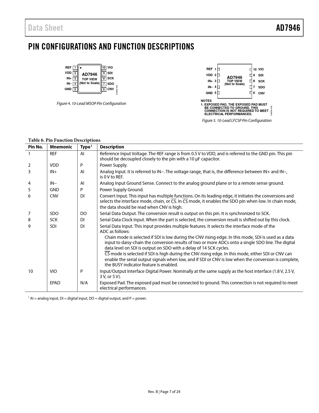 link to page 8 Data SheetAD7946PIN CONFIGURATIONS AND FUNCTION DESCRIPTIONSREF110 VIOREF 110 VIOVDD29SDIAD7946VDD 29SDIIN+38SCKAD7946TOP VIEWIN+ 3TOP VIEW8SCKIN–4(Not to Scale)7SDO(Not to Scale) 004 IN– 47SDOGND56CNV56 04656- GNDCNVNOTES Figure 4. 10-Lead MSOP Pin Configuration 1. EXPOSED PAD. THE EXPOSED PAD MUST BE CONNECTED TO GROUND. THIS 005 CONNECTION IS NOT REQUIRED TO MEET ELECTRICAL PERFORMANCES. 04656- Figure 5. 10-Lead LFCSP Pin Configuration Table 6. Pin Function Descriptions Pin No.MnemonicType1Description 1 REF AI Reference Input Voltage. The REF range is from 0.5 V to VDD, and is referred to the GND pin. This pin should be decoupled closely to the pin with a 10 µF capacitor. 2 VDD P Power Supply. 3 IN+ AI Analog Input. It is referred to IN−. The voltage range, that is, the difference between IN+ and IN−, is 0 V to REF. 4 IN− AI Analog Input Ground Sense. Connect to the analog ground plane or to a remote sense ground. 5 GND P Power Supply Ground. 6 CNV DI Convert Input. This input has multiple functions. On its leading edge, it initiates the conversions and selects the interface mode, chain, or CS. In CS mode, it enables the SDO pin when low. In chain mode, the data should be read when CNV is high. 7 SDO DO Serial Data Output. The conversion result is output on this pin. It is synchronized to SCK. 8 SCK DI Serial Data Clock Input. When the part is selected, the conversion result is shifted out by this clock. 9 SDI DI Serial Data Input. This input provides multiple features. It selects the interface mode of the ADC as follows: Chain mode is selected if SDI is low during the CNV rising edge. In this mode, SDI is used as a data input to daisy-chain the conversion results of two or more ADCs onto a single SDO line. The digital data level on SDI is output on SDO with a delay of 14 SCK cycles. CS mode is selected if SDI is high during the CNV rising edge. In this mode, either SDI or CNV can enable the serial output signals when low, and if SDI or CNV is low when the conversion is complete, the BUSY indicator feature is enabled. 10 VIO P Input/Output Interface Digital Power. Nominally at the same supply as the host interface (1.8 V, 2.5 V, 3 V, or 5 V). EPAD N/A Exposed Pad. The exposed pad must be connected to ground. This connection is not required to meet electrical performances. 1 AI = analog input, DI = digital input, DO = digital output, and P = power. Rev. B | Page 7 of 24 Document Outline Features Applications Typical Application Circuit General Description Table of Contents Revision History Specifications Timing Specifications Absolute Maximum Ratings ESD Caution Pin Configurations and Function Descriptions Typical Performance Characteristics Terminology Theory of Operation Circuit Information Converter Operation Transfer Functions Typical Connection Diagram Analog Input Driver Amplifier Choice Voltage Reference Input Power Supply Supplying the ADC from the Reference Single-Supply Application Digital Interface CS/ MODE 3-Wire, No BUSY Indicator CS/ Mode 3-Wire with BUSY Indicator CS/ Mode 4-Wire, No BUSY Indicator CS/ Mode 4-Wire with BUSY Indicator Chain Mode, No BUSY Indicator Chain Mode with BUSY Indicator Application Guidelines Layout Evaluating the Performance of the AD7946 Outline Dimensions Ordering Guide