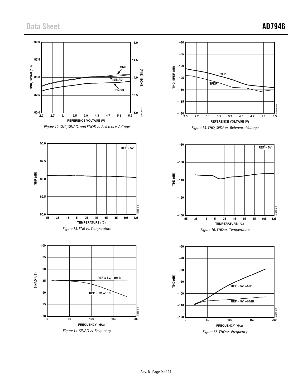 Data Sheet. AD7946. 90.0. 15.0. –90. –95. 87.5. 14.5. SNR. –100. ts) Bi. THD. INAD ( 85.0. 14.0. B (. –105. SINAD. SFDR. NR,. THD, SFDR (dB). ENOB. –110. 82.5. 13.5
