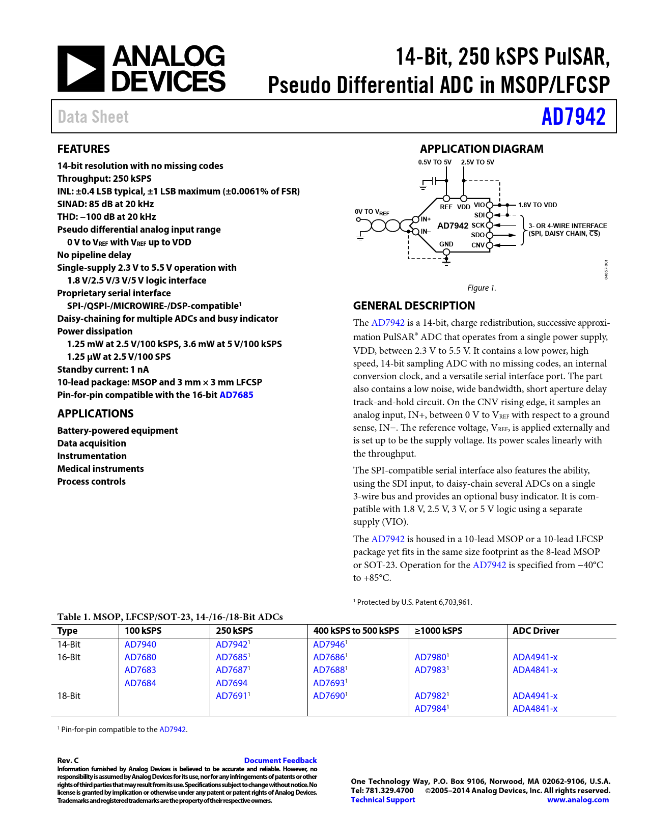 The AD7942 is a 14-bit, charge redistribution, successive approxi-