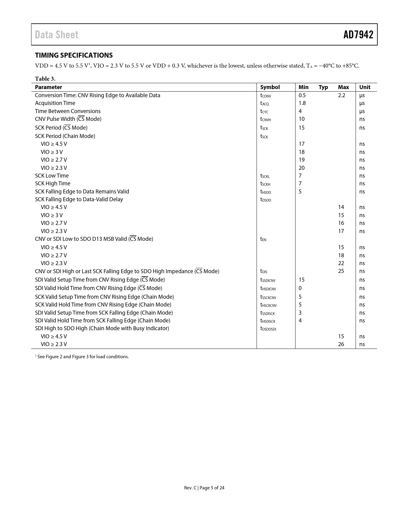 Data Sheet. AD7942. TIMING SPECIFICATIONS. Table 3. Parameter. Symbol Min. Typ. Max. Unit