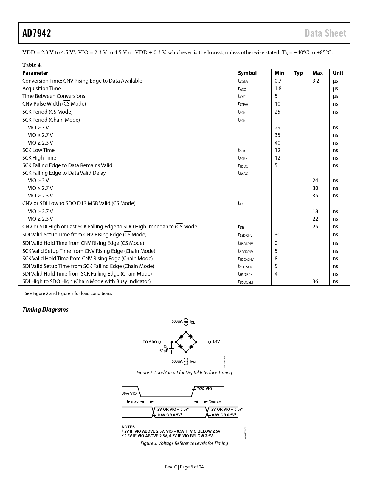 link to page 7 link to page 7 link to page 7 AD7942Data Sheet VDD = 2.3 V to 4.5 V1, VIO = 2.3 V to 4.5 V or VDD + 0.3 V, whichever is the lowest, unless otherwise stated, TA = −40°C to +85°C. Table 4. ParameterSymbol MinTypMaxUnit Conversion Time: CNV Rising Edge to Data Available tCONV 0.7 3.2 μs Acquisition Time tACQ 1.8 μs Time Between Conversions tCYC 5 μs CNV Pulse Width (CS Mode) tCNVH 10 ns SCK Period (CS Mode) tSCK 25 ns SCK Period (Chain Mode) tSCK VIO ≥ 3 V 29 ns VIO ≥ 2.7 V 35 ns VIO ≥ 2.3 V 40 ns SCK Low Time tSCKL 12 ns SCK High Time tSCKH 12 ns SCK Falling Edge to Data Remains Valid tHSDO 5 ns SCK Falling Edge to Data Valid Delay tDSDO VIO ≥ 3 V 24 ns VIO ≥ 2.7 V 30 ns VIO ≥ 2.3 V 35 ns CNV or SDI Low to SDO D13 MSB Valid (CS Mode) tEN VIO ≥ 2.7 V 18 ns VIO ≥ 2.3 V 22 ns CNV or SDI High or Last SCK Falling Edge to SDO High Impedance (CS Mode) tDIS 25 ns SDI Valid Setup Time from CNV Rising Edge (CS Mode) tSSDICNV 30 ns SDI Valid Hold Time from CNV Rising Edge (CS Mode) tHSDICNV 0 ns SCK Valid Setup Time from CNV Rising Edge (Chain Mode) tSSCKCNV 5 ns SCK Valid Hold Time from CNV Rising Edge (Chain Mode) tHSCKCNV 8 ns SDI Valid Setup Time from SCK Falling Edge (Chain Mode) tSSDISCK 5 ns SDI Valid Hold Time from SCK Falling Edge (Chain Mode) tHSDISCK 4 ns SDI High to SDO High (Chain Mode with Busy Indicator) tDSDOSDI 36 ns 1 See Figure 2 and Figure 3 for load conditions. Timing Diagrams500µAIOLTO SDO1.4VCL50pF 02 500µAI 0 OH 7- 465 0 Figure 2. Load Circuit for Digital Interface Timing 70% VIO30% VIOtDELAYtDELAY2V OR VIO – 0.5V12V OR VIO – 0.5V10.8V OR 0.5V20.8V OR 0.5V2NOTES 03 1 2V IF VIO ABOVE 2.5V, VIO – 0.5V IF VIO BELOW 2.5V. 0 7- 2 0.8V IF VIO ABOVE 2.5V, 0.5V IF VIO BELOW 2.5V. 65 04 Figure 3. Voltage Reference Levels for Timing Rev. C | Page 6 of 24 Document Outline Features Applications Application Diagram General Description Table of Contents Revision History Specifications Timing Specifications Timing Diagrams Absolute Maximum Ratings ESD Caution Pin Configuration and Function Descriptions Typical Performance Characteristics Terminology Theory of Operation Circuit Information Converter Operation Transfer Functions Typical Connection Diagram Analog Input Driver Amplifier Choice Voltage Reference Input Power Supply Supplying the ADC from the Reference Digital Interface /CS Mode 3-Wire Without Busy Indicator /CS Mode 3-Wire with Busy Indicator /CS Mode 4-Wire Without Busy Indicator /CS Mode 4-Wire with Busy Indicator Chain Mode Without Busy Indicator Chain Mode with Busy Indicator Application Hints Layout Evaluating the Performance of AD7942 Outline Dimensions Ordering Guide