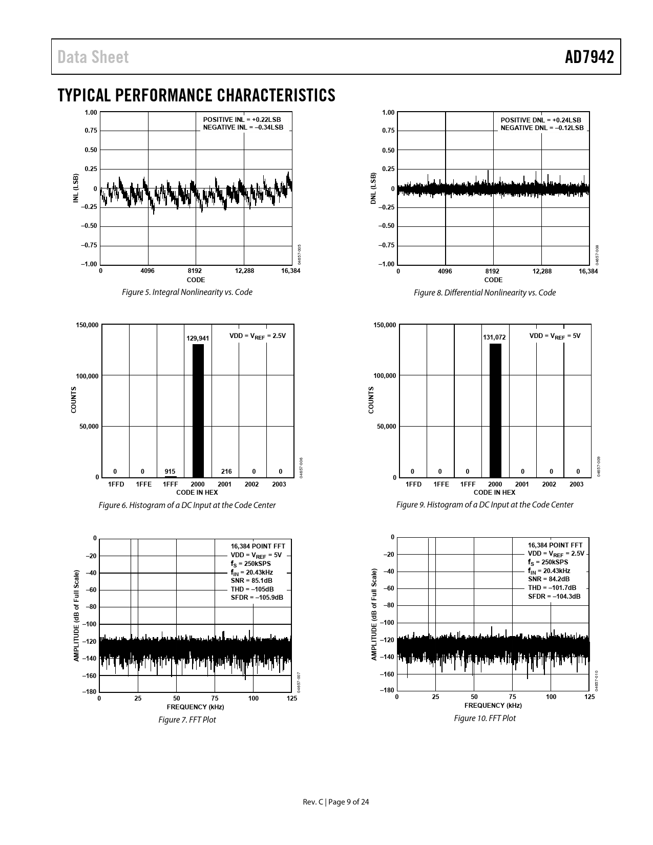 Figure 7. FFT Plot Figure 10. FFT Plot Rev. C | Page 9 of 24 Document Outline Features Applications Application Diagram General Description Table of Contents Revision History Specifications Timing Specifications Timing Diagrams Absolute Maximum Ratings ESD Caution Pin Configuration and Function Descriptions Typical Performance Characteristics Terminology Theory of Operation Circuit Information Converter Operation Transfer Functions Typical Connection Diagram Analog Input Driver Amplifier Choice Voltage Reference Input Power Supply Supplying the ADC from the Reference Digital Interface /CS Mode 3-Wire Without Busy Indicator /CS Mode 3-Wire with Busy Indicator /CS Mode 4-Wire Without Busy Indicator /CS Mode 4-Wire with Busy Indicator Chain Mode Without Busy Indicator Chain Mode with Busy Indicator Application Hints Layout Evaluating the Performance of AD7942 Outline Dimensions Ordering Guide