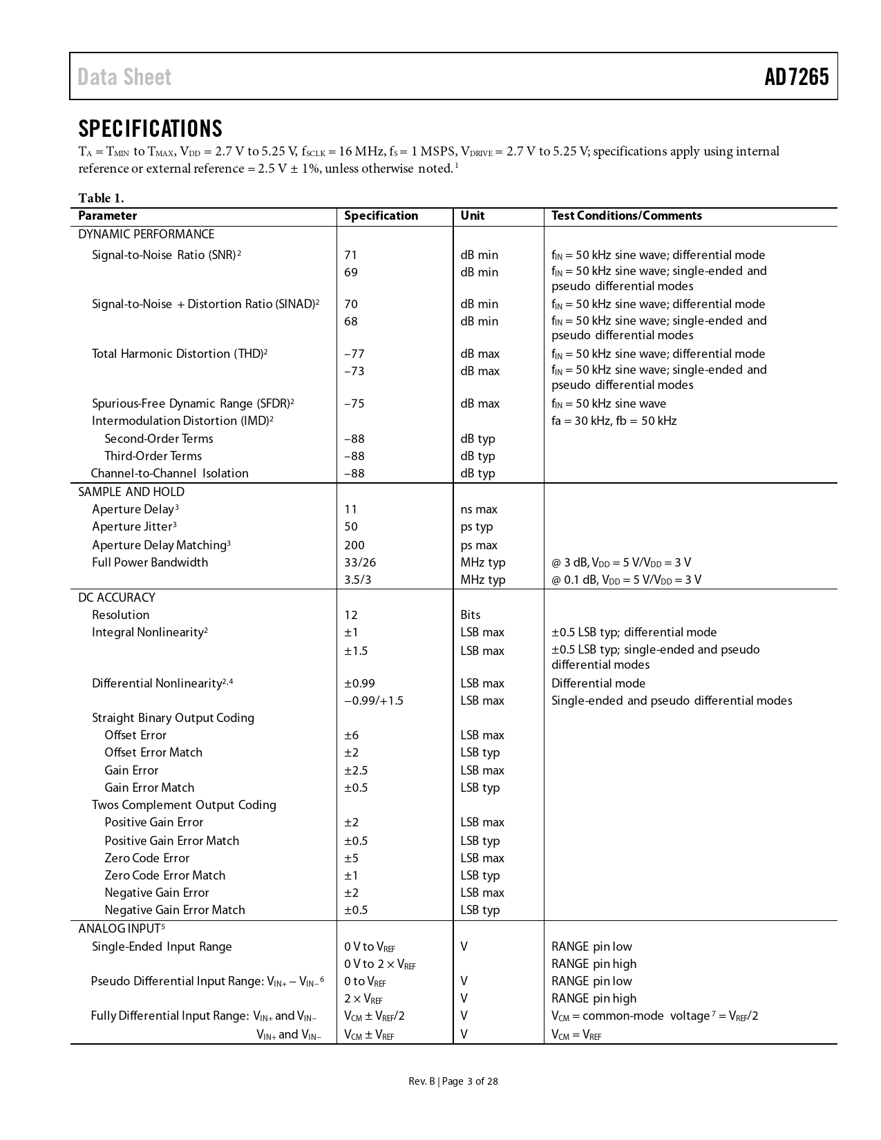 link to page 5 link to page 5 link to page 5 link to page 5 link to page 5 link to page 5 link to page 5 link to page 5 link to page 5 link to page 5 link to page 5 link to page 5 link to page 5 link to page 5 link to page 5 Data SheetAD7265SPECIFICATIONS TA = TMIN to TMAX, VDD = 2.7 V to 5.25 V, fSCLK = 16 MHz, fS = 1 MSPS, VDRIVE = 2.7 V to 5.25 V; specifications apply using internal reference or external reference = 2.5 V ± 1%, unless otherwise noted.1 Table 1. ParameterSpecificationUnitTest Conditions/Comments DYNAMIC PERFORMANCE Signal-to-Noise Ratio (SNR)2 71 dB min fIN = 50 kHz sine wave; differential mode 69 dB min fIN = 50 kHz sine wave; single-ended and pseudo differential modes Signal-to-Noise + Distortion Ratio (SINAD)2 70 dB min fIN = 50 kHz sine wave; differential mode 68 dB min fIN = 50 kHz sine wave; single-ended and pseudo differential modes Total Harmonic Distortion (THD)2 –77 dB max fIN = 50 kHz sine wave; differential mode –73 dB max fIN = 50 kHz sine wave; single-ended and pseudo differential modes Spurious-Free Dynamic Range (SFDR)2 –75 dB max fIN = 50 kHz sine wave Intermodulation Distortion (IMD)2 fa = 30 kHz, fb = 50 kHz Second-Order Terms –88 dB typ Third-Order Terms –88 dB typ Channel-to-Channel Isolation –88 dB typ SAMPLE AND HOLD Aperture Delay3 11 ns max Aperture Jitter3 50 ps typ Aperture Delay Matching3 200 ps max Full Power Bandwidth 33/26 MHz typ @ 3 dB, VDD = 5 V/VDD = 3 V 3.5/3 MHz typ @ 0.1 dB, VDD = 5 V/VDD = 3 V DC ACCURACY Resolution 12 Bits Integral Nonlinearity2 ±1 LSB max ±0.5 LSB typ; differential mode ±1.5 LSB max ±0.5 LSB typ; single-ended and pseudo differential modes Differential Nonlinearity2,4 ±0.99 LSB max Differential mode −0.99/+1.5 LSB max Single-ended and pseudo differential modes Straight Binary Output Coding Offset Error ±6 LSB max Offset Error Match ±2 LSB typ Gain Error ±2.5 LSB max Gain Error Match ±0.5 LSB typ Twos Complement Output Coding Positive Gain Error ±2 LSB max Positive Gain Error Match ±0.5 LSB typ Zero Code Error ±5 LSB max Zero Code Error Match ±1 LSB typ Negative Gain Error ±2 LSB max Negative Gain Error Match ±0.5 LSB typ ANALOG INPUT5 Single-Ended Input Range 0 V to VREF V RANGE pin low 0 V to 2 × VREF RANGE pin high Pseudo Differential Input Range: V 6 IN+ − VIN− 0 to VREF V RANGE pin low 2 × VREF V RANGE pin high Fully Differential Input Range: VIN+ and VIN− VCM ± VREF/2 V VCM = common-mode voltage 7 = VREF/2 VIN+ and VIN− VCM ± VREF V VCM = VREF Rev. B | Page 3 of 28 Document Outline FEATURES GENERAL DESCRIPTION FUNCTIONAL BLOCK DIAGRAM PRODUCT HIGHLIGHTS REVISION HISTORY SPECIFICATIONS TIMING SPECIFICATIONS ABSOLUTE MAXIMUM RATINGS ESD CAUTION PIN CONFIGURATIONS AND FUNCTION DESCRIPTIONS TYPICAL PERFORMANCE CHARACTERISTICS TERMINOLOGY THEORY OF OPERATION CIRCUIT INFORMATION CONVERTER OPERATION ANALOG INPUT STRUCTURE ANALOG INPUTS Single-Ended Mode Differential Mode Driving Differential Inputs Using an Op Amp Pair Pseudo Differential Mode ANALOG INPUT SELECTION OUTPUT CODING TRANSFER FUNCTIONS DIGITAL INPUTS VDRIVE MODES OF OPERATION NORMAL MODE PARTIAL POWER-DOWN MODE FULL POWER-DOWN MODE POWER-UP TIMES POWER vs. THROUGHPUT RATE SERIAL INTERFACE MICROPROCESSOR INTERFACING AD7265 TO ADSP-218x AD7265 to ADSP-BF53x AD7265 TO TMS320C541 AD7265 TO DSP563xx APPLICATION HINTS GROUNDING AND LAYOUT PCB DESIGN GUIDELINES FOR LFCSP EVALUATING THE AD7265 PERFORMANCE OUTLINE DIMENSIONS ORDERING GUIDE