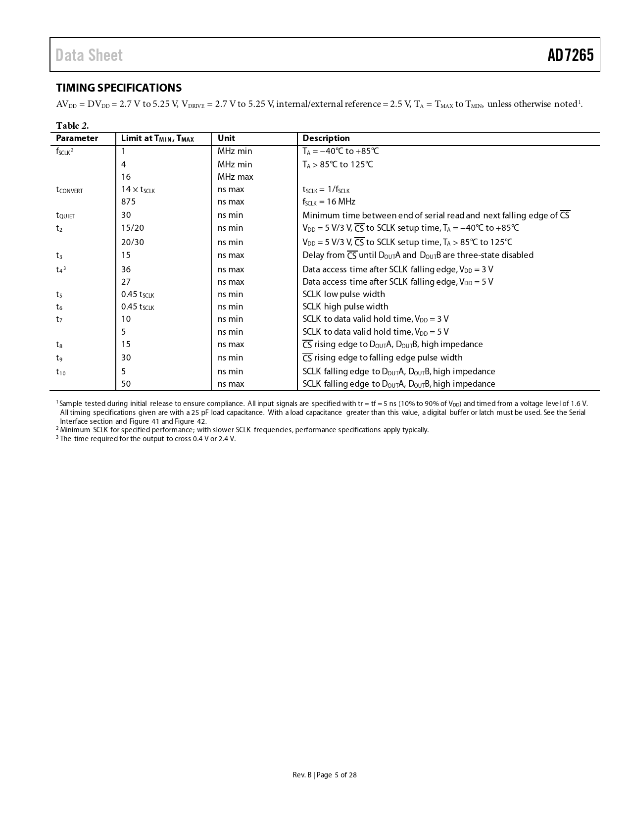 link to page 23 link to page 23 link to page 23 link to page 23 Data SheetAD7265TIMING SPECIFICATIONS AVDD = DVDD = 2.7 V to 5.25 V, VDRIVE = 2.7 V to 5.25 V, internal/external reference = 2.5 V, TA = TMAX to TMIN, unless otherwise noted1. Table 2. ParameterLimit at TMIN, TMAXUnitDescription fSCLK2 1 MHz min TA = −40°C to +85°C 4 MHz min TA > 85°C to 125°C 16 MHz max tCONVERT 14 × tSCLK ns max tSCLK = 1/fSCLK 875 ns max fSCLK = 16 MHz tQUIET 30 ns min Minimum time between end of serial read and next falling edge of CS t2 15/20 ns min VDD = 5 V/3 V, CS to SCLK setup time, TA = −40°C to +85°C 20/30 ns min VDD = 5 V/3 V, CS to SCLK setup time, TA > 85°C to 125°C t3 15 ns max Delay from CS until DOUTA and DOUTB are three-state disabled t4 3 36 ns max Data access time after SCLK falling edge, VDD = 3 V 27 ns max Data access time after SCLK falling edge, VDD = 5 V t5 0.45 tSCLK ns min SCLK low pulse width t6 0.45 tSCLK ns min SCLK high pulse width t7 10 ns min SCLK to data valid hold time, VDD = 3 V 5 ns min SCLK to data valid hold time, VDD = 5 V t8 15 ns max CS rising edge to DOUTA, DOUTB, high impedance t9 30 ns min CS rising edge to falling edge pulse width t10 5 ns min SCLK falling edge to DOUTA, DOUTB, high impedance 50 ns max SCLK falling edge to DOUTA, DOUTB, high impedance 1 Sample tested during initial release to ensure compliance. All input signals are specified with tr = tf = 5 ns (10% to 90% of VDD) and timed from a voltage level of 1.6 V. Al timing specifications given are with a 25 pF load capacitance. With a load capacitance greater than this value, a digital buffer or latch must be used. See the Serial Interface section and Figure 41 and Figure 42. 2 Minimum SCLK for specified performance; with slower SCLK frequencies, performance specifications apply typical y. 3 The time required for the output to cross 0.4 V or 2.4 V. Rev. B | Page 5 of 28 Document Outline FEATURES GENERAL DESCRIPTION FUNCTIONAL BLOCK DIAGRAM PRODUCT HIGHLIGHTS REVISION HISTORY SPECIFICATIONS TIMING SPECIFICATIONS ABSOLUTE MAXIMUM RATINGS ESD CAUTION PIN CONFIGURATIONS AND FUNCTION DESCRIPTIONS TYPICAL PERFORMANCE CHARACTERISTICS TERMINOLOGY THEORY OF OPERATION CIRCUIT INFORMATION CONVERTER OPERATION ANALOG INPUT STRUCTURE ANALOG INPUTS Single-Ended Mode Differential Mode Driving Differential Inputs Using an Op Amp Pair Pseudo Differential Mode ANALOG INPUT SELECTION OUTPUT CODING TRANSFER FUNCTIONS DIGITAL INPUTS VDRIVE MODES OF OPERATION NORMAL MODE PARTIAL POWER-DOWN MODE FULL POWER-DOWN MODE POWER-UP TIMES POWER vs. THROUGHPUT RATE SERIAL INTERFACE MICROPROCESSOR INTERFACING AD7265 TO ADSP-218x AD7265 to ADSP-BF53x AD7265 TO TMS320C541 AD7265 TO DSP563xx APPLICATION HINTS GROUNDING AND LAYOUT PCB DESIGN GUIDELINES FOR LFCSP EVALUATING THE AD7265 PERFORMANCE OUTLINE DIMENSIONS ORDERING GUIDE