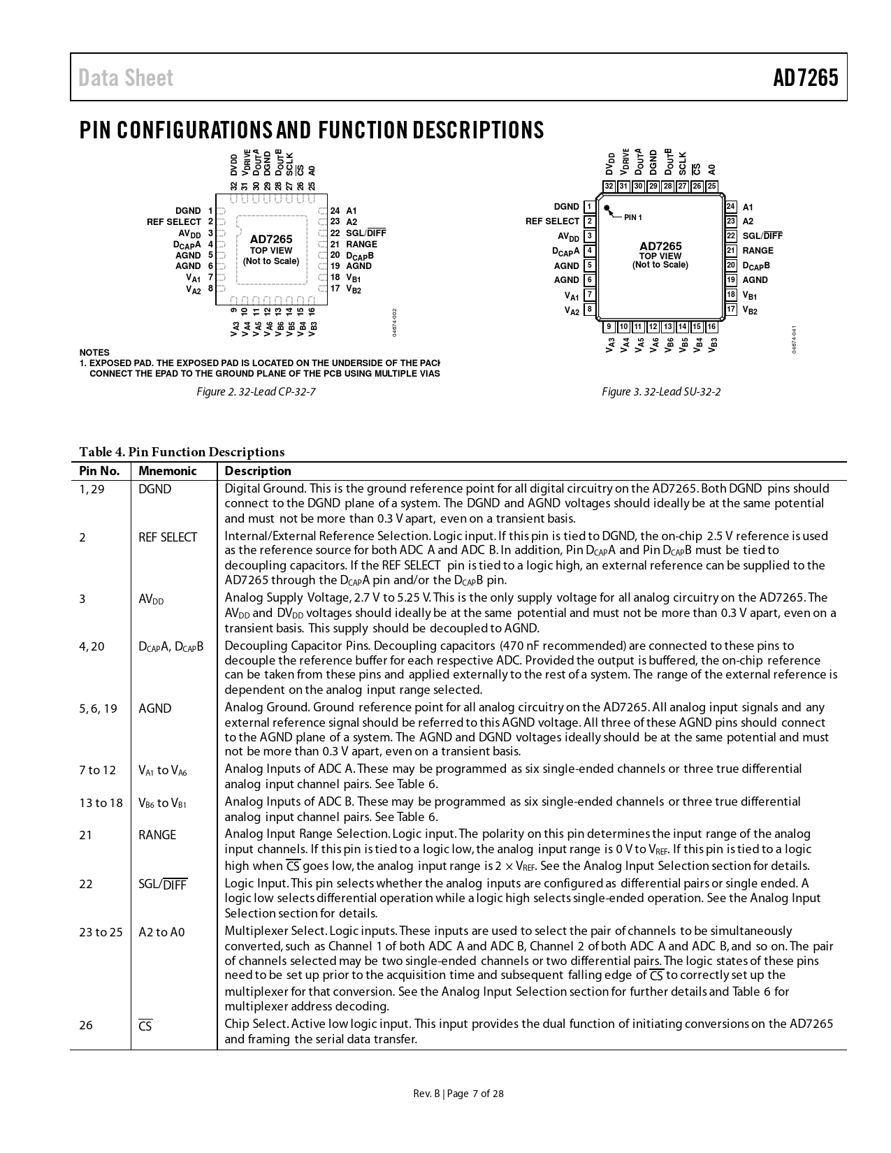 Data Sheet AD7265 PIN CONFIGURATIONS AND FUNCTION DESCRIPTIONS DRI 32 31 30 29 28 27 26 DGND 1 24 A1 PIN 1 REF SELECT 2 23 A2