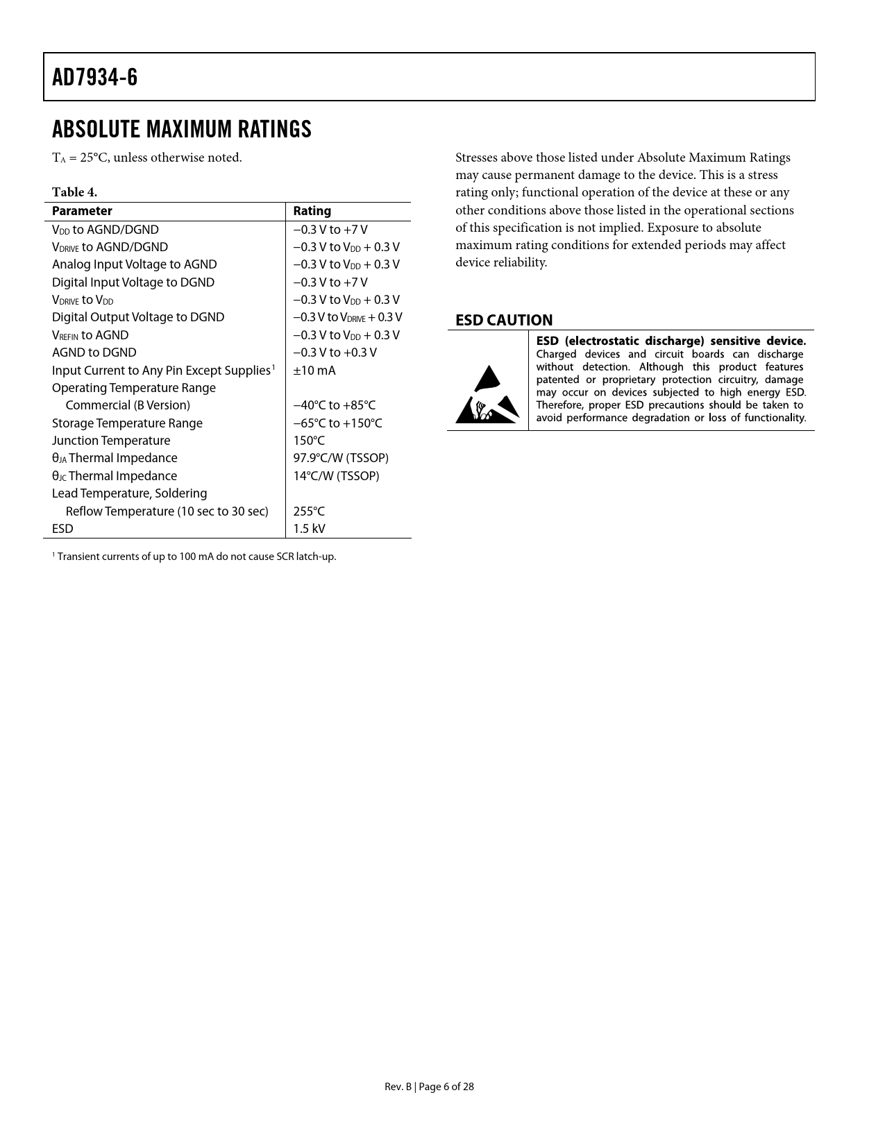 AD7934-6. ABSOLUTE MAXIMUM RATINGS. Table 4. Parameter Rating. ESD CAUTION