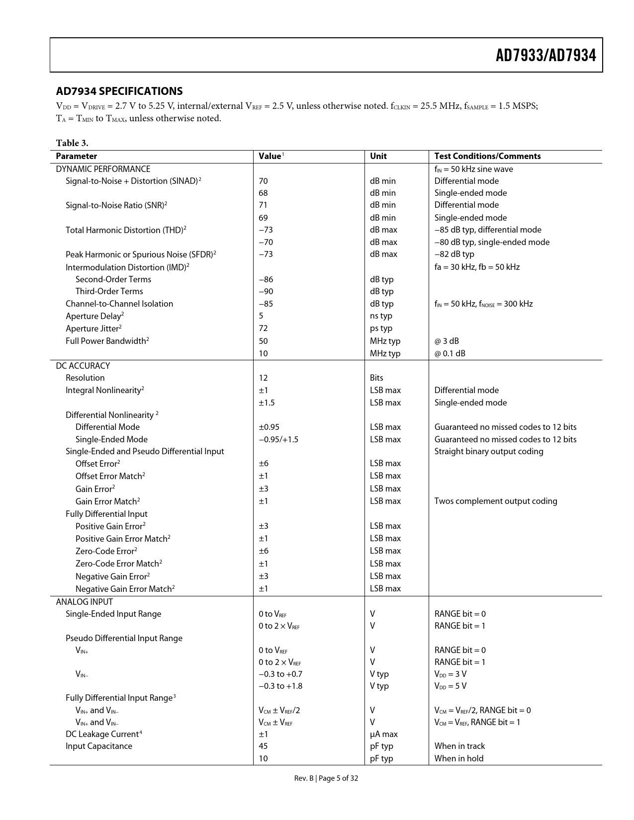 AD7933/AD7934. AD7934 SPECIFICATIONS. Table 3. Parameter. Value. Unit. Test Conditions/Comments