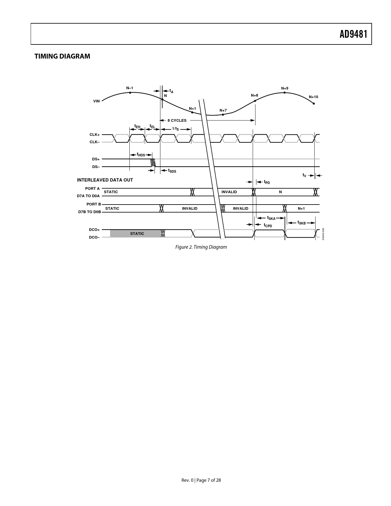 AD9481. TIMING DIAGRAM. N–1. N+9. N+8. N+10. VIN. N+1. N+7. 8 CYCLES. tEH. tEL. 1/fS. CLK+. CLK–. tHDS. DS+. DS–. tSDS. INTERLEAVED DATA OUT. tPD. PORT A. STATIC