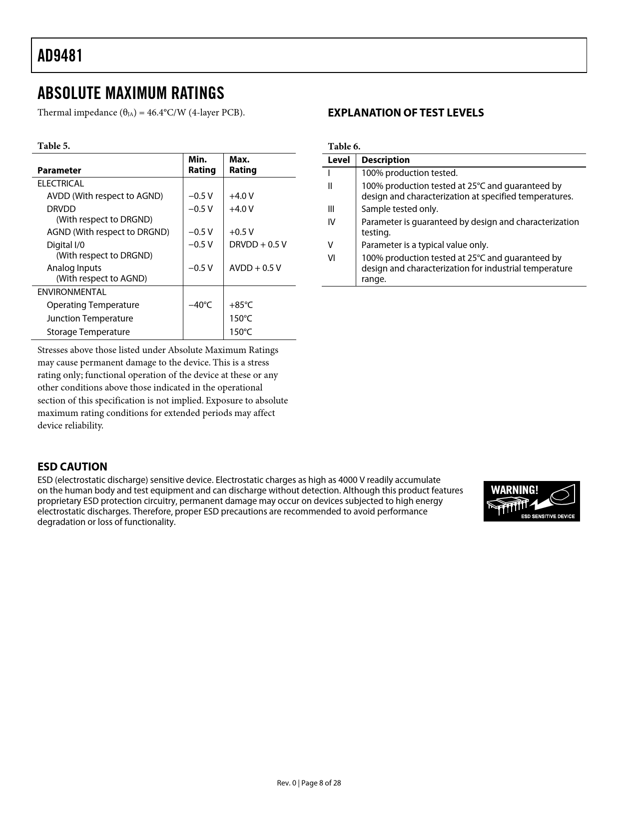 AD9481 ABSOLUTE MAXIMUM RATINGS EXPLANATION OF TEST LEVELS Table 5 Table 6 Min Max Level Description Parameter Rating ESD CAUTION
