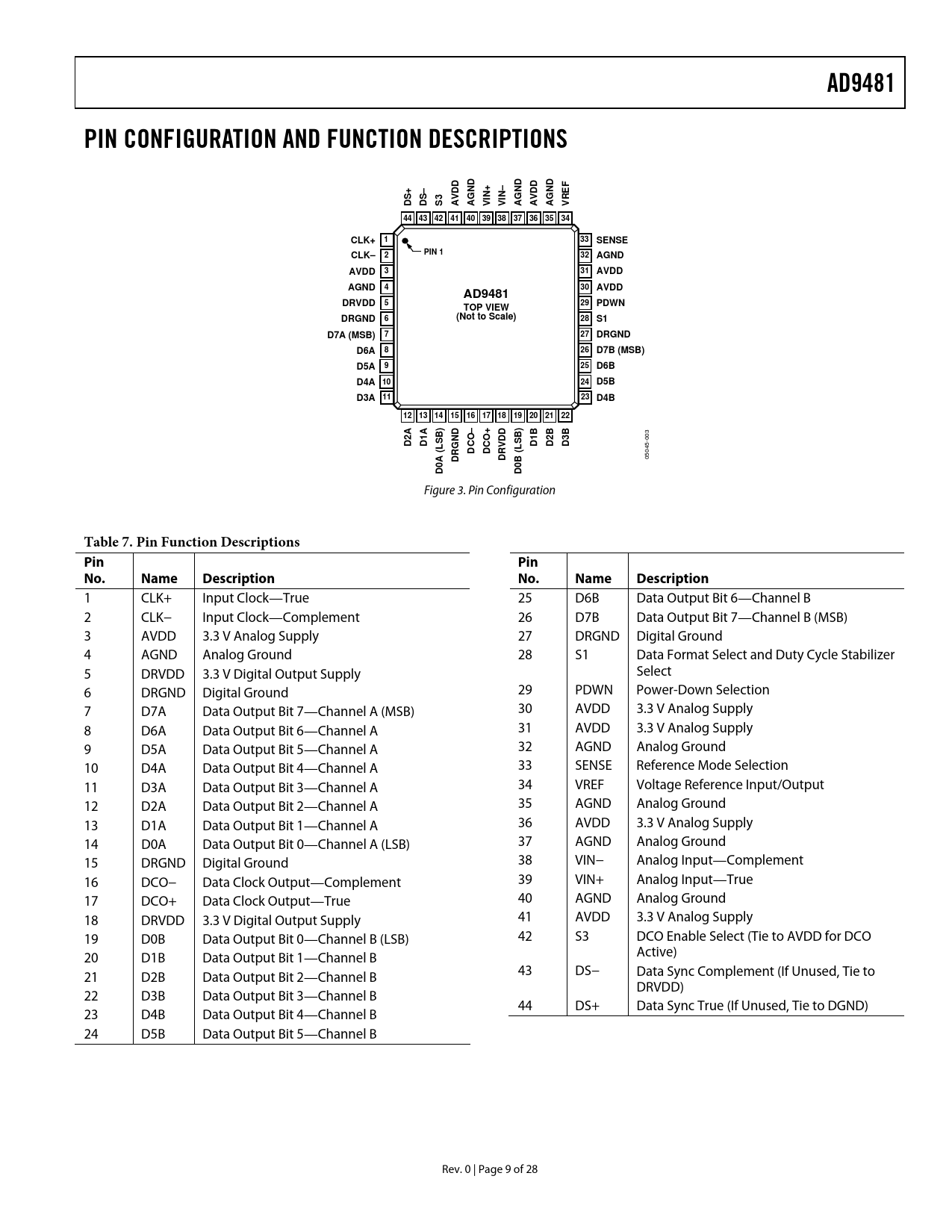AD9481PIN CONFIGURATION AND FUNCTION DESCRIPTIONS+–DD+–DDEFDSDSS3AVAGNDVINVINAGNDAVAGNDVR44 43 424140 39 3837363534CLK+ 133SENSECLK–2PIN 132AGNDAVDD331AVDDAGND430AVDDAD9481DRVDD529PDWNTOP VIEWDRGND6(Not to Scale)28S1D7A (MSB)727DRGNDD6A826D7B (MSB)D5A925D6BD4A 1024D5BD3A 1123 D4B12 13 141516 17 1819202122AA))BBBBDDBD2D1D1D2D3DCO–DCO+A (LSDRGNDDRVB (LS 05045-003 D0D0 Figure 3. Pin Configuration Table 7. Pin Function Descriptions PinPinNo. NameDescriptionNo. NameDescription 1 CLK+ Input Clock—True 25 D6B Data Output Bit 6—Channel B 2 CLK− Input Clock—Complement 26 D7B Data Output Bit 7—Channel B (MSB) 3 AVDD 3.3 V Analog Supply 27 DRGND Digital Ground 4 AGND Analog Ground 28 S1 Data Format Select and Duty Cycle Stabilizer 5 DRVDD 3.3 V Digital Output Supply Select 6 DRGND Digital Ground 29 PDWN Power-Down Selection 7 D7A Data Output Bit 7—Channel A (MSB) 30 AVDD 3.3 V Analog Supply 8 D6A Data Output Bit 6—Channel A 31 AVDD 3.3 V Analog Supply 9 D5A Data Output Bit 5—Channel A 32 AGND Analog Ground 10 D4A Data Output Bit 4—Channel A 33 SENSE Reference Mode Selection 11 D3A Data Output Bit 3—Channel A 34 VREF Voltage Reference Input/Output 12 D2A Data Output Bit 2—Channel A 35 AGND Analog Ground 13 D1A Data Output Bit 1—Channel A 36 AVDD 3.3 V Analog Supply 14 D0A Data Output Bit 0—Channel A (LSB) 37 AGND Analog Ground 15 DRGND Digital Ground 38 VIN− Analog Input—Complement 16 DCO− Data Clock Output—Complement 39 VIN+ Analog Input—True 17 DCO+ Data Clock Output—True 40 AGND Analog Ground 18 DRVDD 3.3 V Digital Output Supply 41 AVDD 3.3 V Analog Supply 19 D0B Data Output Bit 0—Channel B (LSB) 42 S3 DCO Enable Select (Tie to AVDD for DCO 20 D1B Data Output Bit 1—Channel B Active) 21 D2B Data Output Bit 2—Channel B 43 DS− Data Sync Complement (If Unused, Tie to DRVDD) 22 D3B Data Output Bit 3—Channel B 44 DS+ Data Sync True (If Unused, Tie to DGND) 23 D4B Data Output Bit 4—Channel B 24 D5B Data Output Bit 5—Channel B Rev. 0 | Page 9 of 28 Document Outline FEATURES APPLICATIONS GENERAL DESCRIPTION FUNCTIONAL BLOCK DIAGRAM PRODUCT HIGHLIGHTS TABLE OF CONTENTS DC SPECIFICATIONS DIGITAL SPECIFICATIONS AC SPECIFICATIONS SWITCHING SPECIFICATIONS TIMING DIAGRAM ABSOLUTE MAXIMUM RATINGS EXPLANATION OF TEST LEVELS ESD CAUTION PIN CONFIGURATION AND FUNCTION DESCRIPTIONS TERMINOLOGY TYPICAL PERFORMANCE CHARACTERISTICS EQUIVALENT CIRCUITS APPLICATIONS ANALOG INPUTS VOLTAGE REFERENCE Fixed Reference External Reference Programmable Reference CLOCKING THE AD9481 DS INPUTS DIGITAL OUTPUTS INTERLEAVING TWO AD9481s DATA CLOCK OUT POWER-DOWN INPUT AD9481 EVALUATION BOARD POWER CONNECTOR ANALOG INPUTS GAIN OPTIONAL OPERATIONAL AMPLIFIER CLOCK OPTIONAL CLOCK BUFFER DS OPTIONAL XTAL VOLTAGE REFERENCE DATA OUTPUTS EVALUATION BOARD BILL OF MATERIALS (BOM) PCB SCHEMATICS PCB LAYERS OUTLINE DIMENSIONS ORDERING GUIDE