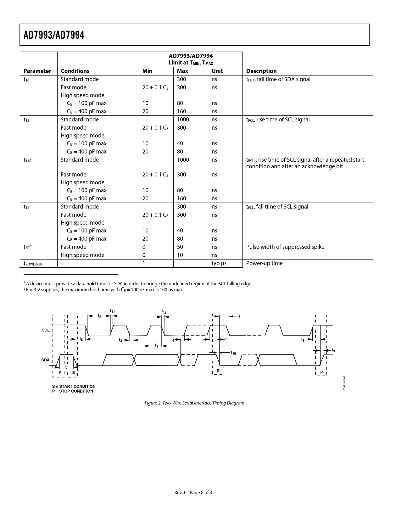 link to page 7 AD7993/AD7994AD7993/AD7994Limit at TMIN, TMAXParameter ConditionsMinMaxUnitDescription t10 Standard mode 300 ns tFDA, fall time of SDA signal Fast mode 20 + 0.1 CB 300 ns High speed mode CB = 100 pF max 10 80 ns CB = 400 pF max 20 160 ns t11 Standard mode 1000 ns tRCL, rise time of SCL signal Fast mode 20 + 0.1 CB 300 ns High speed mode CB = 100 pF max 10 40 ns CB = 400 pF max 20 80 ns t11A Standard mode 1000 ns tRCL1, rise time of SCL signal after a repeated start condition and after an acknowledge bit Fast mode 20 + 0.1 CB 300 ns High speed mode CB = 100 pF max 10 80 ns CB = 400 pF max 20 160 ns t12 Standard mode 300 ns tFCL, fall time of SCL signal Fast mode 20 + 0.1 CB 300 ns High speed mode CB = 100 pF max 10 40 ns CB = 400 pF max 20 80 ns t 2 SP Fast mode 0 50 ns Pulse width of suppressed spike High speed mode 0 10 ns tPOWER-UP 1 typ µs Power-up time 1 A device must provide a data hold time for SDA in order to bridge the undefined region of the SCL falling edge. 2 For 3 V supplies, the maximum hold time with CB = 100 pF max is 100 ns max. t11t12t2t6SCLt6tt4t35t8t1t9t10SDAt7PSSPS = START CONDITION P = STOP CONDITION 03472-0-002 Figure 2. Two-Wire Serial Interface Timing Diagram Rev. 0 | Page 8 of 32 Document Outline FEATURES GENERAL DESCRIPTION FUNCTIONAL BLOCK DIAGRAM PRODUCT HIGHLIGHTS AD7993 SPECIFICATIONS AD7994 SPECIFICATIONS I2C TIMING SPECIFICATIONS ABSOLUTE MAXIMUM RATINGS ESD CAUTION PIN CONFIGURATION AND PIN FUNCTION DESCRIPTIONS TERMINOLOGY TYPICAL PERFORMANCE CHARACTERISTICS CIRCUIT INFORMATION CONVERTER OPERATION TYPICAL CONNECTION DIAGRAM ANALOG INPUT INTERNAL REGISTER STRUCTURE ADDRESS POINTER REGISTER CONFIGURATION REGISTER CONVERSION RESULT REGISTER LIMIT REGISTERS ALERT STATUS REGISTER CYCLE TIMER REGISTER SAMPLE DELAY AND BIT TRIAL DELAY SERIAL INTERFACE SERIAL BUS ADDRESS WRITING TO THE AD7993/AD7994 WRITING TO THE ADDRESS POINTER REGISTER FOR A SUBSEQUENT REA WRITING A SINGLE BYTE OF DATA TO THE ALERT STATUS REGISTER O WRITING TWO BYTES OF DATA TO A LIMIT OR HYSTERESIS REGISTER READING DATA FROM THE AD7993/AD7994 ALERT/BUSY PIN SMBus ALERT BUSY PLACING THE AD7993-1/AD7994-1 INTO HIGH SPEED MODE THE ADDRESS SELECT (AS) PIN MODES OF OPERATION MODE 1—USING THE CONVST PIN MODE 2—COMMAND MODE MODE 3—AUTOMATIC CYCLE INTERVAL MODE OUTLINE DIMENSIONS ORDERING GUIDE RELATED PARTS IN I2C-COMPATIBLE ADC PRODUCT FAMILY