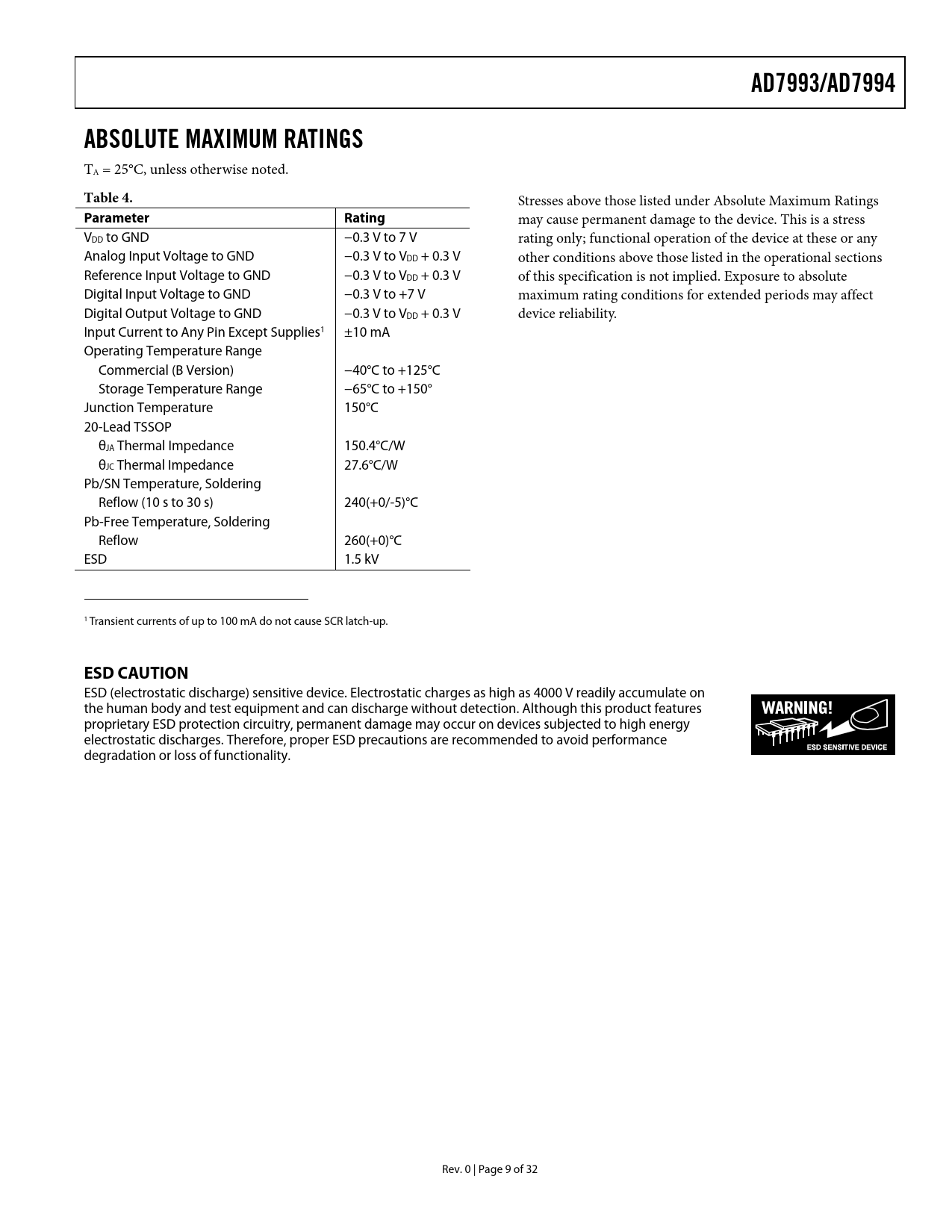 AD7993/AD7994. ABSOLUTE MAXIMUM RATINGS. Table 4. Parameter Rating. ESD CAUTION