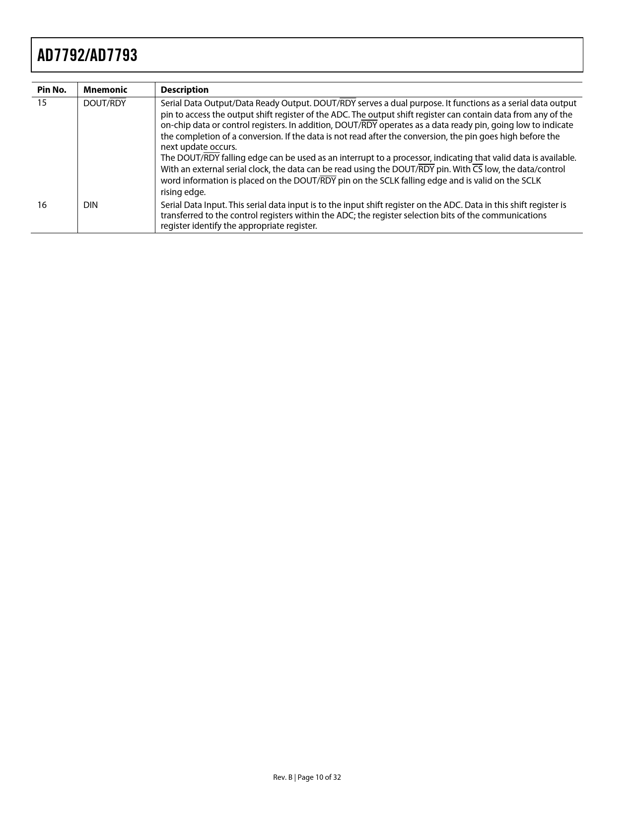 AD7792/AD7793Pin No.MnemonicDescription 15 DOUT/RDY Serial Data Output/Data Ready Output. DOUT/RDY serves a dual purpose. It functions as a serial data output pin to access the output shift register of the ADC. The output shift register can contain data from any of the on-chip data or control registers. In addition, DOUT/RDY operates as a data ready pin, going low to indicate the completion of a conversion. If the data is not read after the conversion, the pin goes high before the next update occurs. The DOUT/RDY falling edge can be used as an interrupt to a processor, indicating that valid data is available. With an external serial clock, the data can be read using the DOUT/RDY pin. With CS low, the data/control word information is placed on the DOUT/RDY pin on the SCLK falling edge and is valid on the SCLK rising edge. 16 DIN Serial Data Input. This serial data input is to the input shift register on the ADC. Data in this shift register is transferred to the control registers within the ADC; the register selection bits of the communications register identify the appropriate register. Rev. B | Page 10 of 32 Document Outline FEATURES APPLICATIONS FUNCTIONAL BLOCK DIAGRAM GENERAL DESCRIPTION TABLE OF CONTENTS REVISION HISTORY SPECIFICATIONS TIMING CHARACTERISTICS TIMING DIAGRAMS ABSOLUTE MAXIMUM RATINGS ESD CAUTION PIN CONFIGURATION AND FUNCTION DESCRIPTIONS OUTPUT NOISE AND RESOLUTION SPECIFICATIONS EXTERNAL REFERENCE INTERNAL REFERENCE TYPICAL PERFORMANCE CHARACTERISTICS ON-CHIP REGISTERS COMMUNICATIONS REGISTER RS2, RS1, RS0 = 0, 0, 0 STATUS REGISTER RS2, RS1, RS0 = 0, 0, 0; Power-On/Reset = 0x80 (AD7792)/0x88 (AD7793) MODE REGISTER RS2, RS1, RS0 = 0, 0, 1; Power-On/Reset = 0x000A CONFIGURATION REGISTER RS2, RS1, RS0 = 0, 1, 0; Power-On/Reset = 0x0710 DATA REGISTER RS2, RS1, RS0 = 0, 1, 1; Power-On/Reset = 0x0000(00) ID REGISTER RS2, RS1, RS0 = 1, 0, 0; Power-On/Reset = 0xXA (AD7792)/0xXB (AD7793) IO REGISTER RS2, RS1, RS0 = 1, 0, 1; Power-On/Reset = 0x00 OFFSET REGISTER RS2, RS1, RS0 = 1, 1, 0; Power-On/Reset = 0x8000 (AD7792)/0x800000 (AD7793) FULL-SCALE REGISTER RS2, RS1, RS0 = 1, 1, 1; Power-On/Reset = 0x5XXX (AD7792)/0x5XXX00 (AD7793) ADC CIRCUIT INFORMATION OVERVIEW DIGITAL INTERFACE Single Conversion Mode Continuous Conversion Mode Continuous Read CIRCUIT DESCRIPTION ANALOG INPUT CHANNEL INSTRUMENTATION AMPLIFIER BIPOLAR/UNIPOLAR CONFIGURATION DATA OUTPUT CODING BURNOUT CURRENTS EXCITATION CURRENTS BIAS VOLTAGE GENERATOR REFERENCE RESET AVDD MONITOR CALIBRATION GROUNDING AND LAYOUT APPLICATIONS INFORMATION TEMPERATURE MEASUREMENT USING A THERMOCOUPLE TEMPERATURE MEASUREMENT USING AN RTD OUTLINE DIMENSIONS ORDERING GUIDE