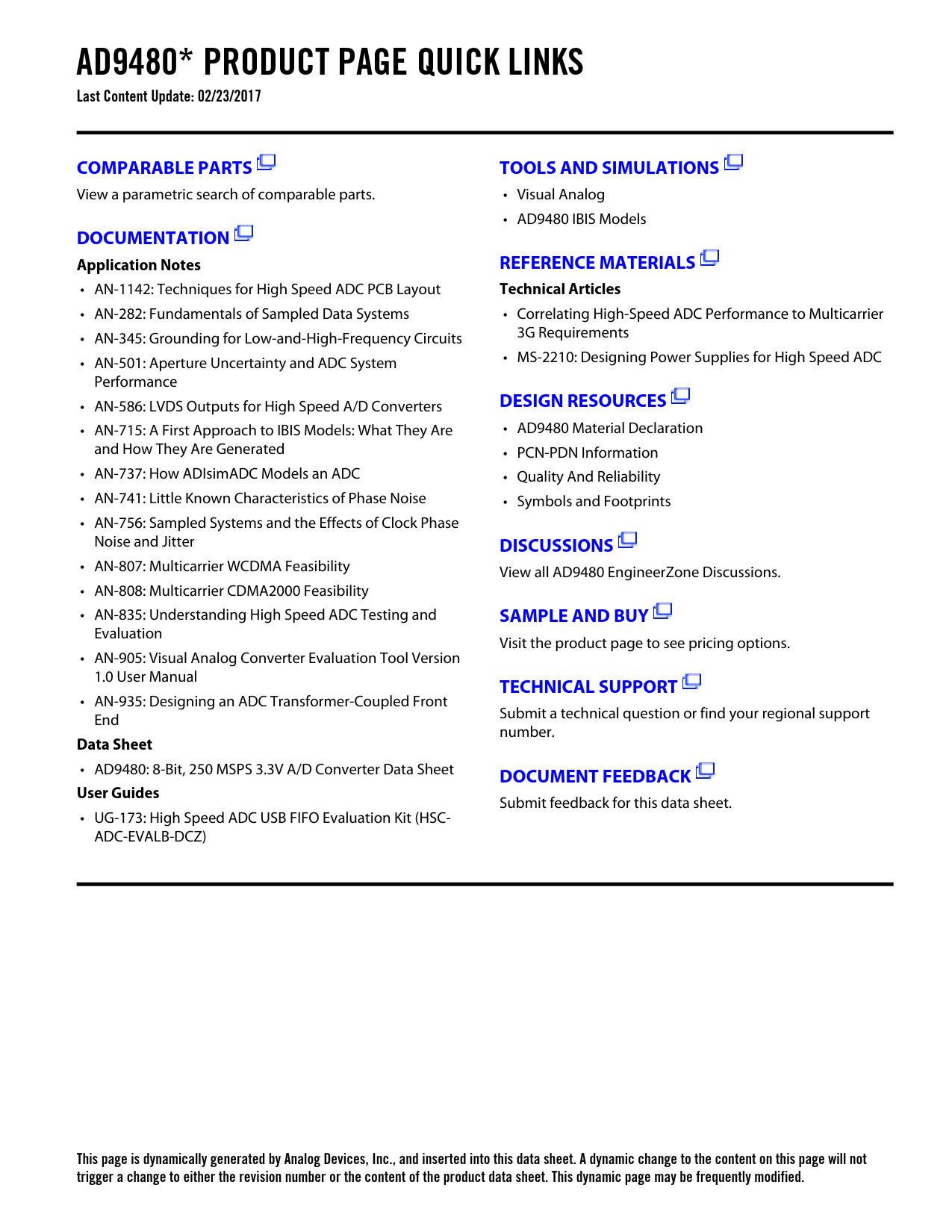 AD9480* PRODUCT PAGE QUICK LINKS Last Content Update: 02/23/2017 COMPARABLE PARTS TOOLS AND SIMULATIONS
