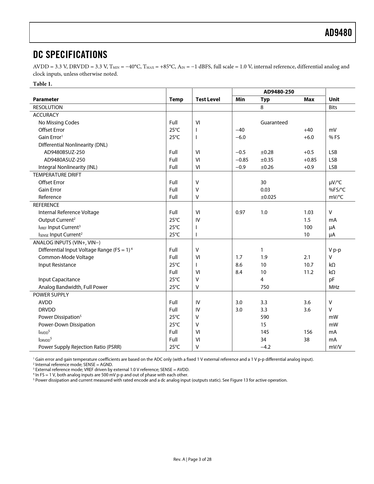 AD9480 DC SPECIFICATIONS Table 1 AD9480-250 Parameter Temp Test Level Min Typ Max Unit