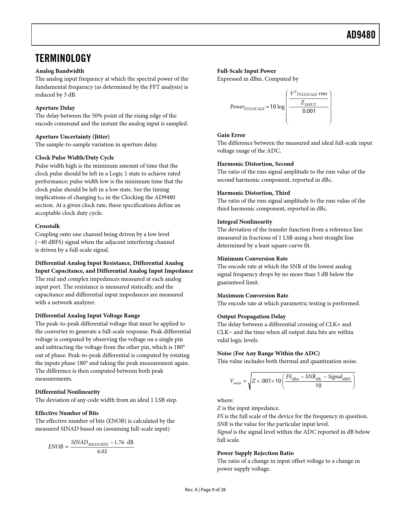 link to page 17 AD9480TERMINOLOGY Analog BandwidthFull-Scale Input Power The analog input frequency at which the spectral power of the Expressed in dBm. Computed by fundamental frequency (as determined by the FFT analysis) is 2 reduced by 3 dB. ⎛ V FULLSCALE rms ⎞ ⎜ ⎟ ⎜ Z ⎟ INPUT Aperture Delay Power = 10 log FULLSCALE ⎜ ⎟ ⎜ 0.001 ⎟ The delay between the 50% point of the rising edge of the ⎜ ⎟ encode command and the instant the analog input is sampled. ⎝ ⎠ Aperture Uncertainty (Jitter)Gain Error The sample-to-sample variation in aperture delay. The difference between the measured and ideal full-scale input voltage range of the ADC. Clock Pulse Width/Duty Cycle Pulse width high is the minimum amount of time that the Harmonic Distortion, Second clock pulse should be left in a Logic 1 state to achieve rated The ratio of the rms signal amplitude to the rms value of the performance; pulse width low is the minimum time that the second harmonic component, reported in dBc. clock pulse should be left in a low state. See the timing Harmonic Distortion, Third implications of changing tEH in the Clocking the AD9480 The ratio of the rms signal amplitude to the rms value of the section. At a given clock rate, these specifications define an third harmonic component, reported in dBc. acceptable clock duty cycle. Integral NonlinearityCrosstalk The deviation of the transfer function from a reference line Coupling onto one channel being driven by a low level measured in fractions of 1 LSB using a best straight line (−40 dBFS) signal when the adjacent interfering channel determined by a least square curve fit. is driven by a full-scale signal. Minimum Conversion RateDifferential Analog Input Resistance, Differential Analog The encode rate at which the SNR of the lowest analog Input Capacitance, and Differential Analog Input Impedance signal frequency drops by no more than 3 dB below the The real and complex impedances measured at each analog guaranteed limit. input port. The resistance is measured statically, and the capacitance and differential input impedances are measured Maximum Conversion Rate with a network analyzer. The encode rate at which parametric testing is performed. Differential Analog Input Voltage RangeOutput Propagation Delay The peak-to-peak differential voltage that must be applied to The delay between a differential crossing of CLK+ and the converter to generate a full-scale response. Peak differential CLK− and the time when all output data bits are within voltage is computed by observing the voltage on a single pin valid logic levels. and subtracting the voltage from the other pin, which is 180° out of phase. Peak-to-peak differential is computed by rotating Noise (For Any Range Within the ADC) the inputs phase 180° and taking the peak measurement again. This value includes both thermal and quantization noise. The difference is then computed between both peak FS − measurements. ⎛ SNR − Signal ⎞ V = Z × .001×10 noise ⎜⎜ dBm dBc dBFS ⎟⎟ ⎝ 10 ⎠ Differential Nonlinearity The deviation of any code width from an ideal 1 LSB step. where: Z is the input impedance. Effective Number of Bits FS is the full scale of the device for the frequency in question. The effective number of bits (ENOB) is calculated by the SNR is the value for the particular input level. measured SINAD based on (assuming full-scale input) Signal is the signal level within the ADC reported in dB below SINAD − 1.76 dB full scale. ENOB = MEASURED 6.02 Power Supply Rejection Ratio The ratio of a change in input offset voltage to a change in power supply voltage. Rev. A | Page 9 of 28 Document Outline FEATURES APPLICATIONS FUNCTIONAL BLOCK DIAGRAM GENERAL DESCRIPTION PRODUCT HIGHLIGHTS TABLE OF CONTENTS REVISION HISTORY DC SPECIFICATIONS DIGITAL SPECIFICATIONS AC SPECIFICATIONS SWITCHING SPECIFICATIONS TIMING DIAGRAM ABSOLUTE MAXIMUM RATINGS EXPLANATION OF TEST LEVELS ESD CAUTION PIN CONFIGURATION AND FUNCTION DESCRIPTIONS TERMINOLOGY TYPICAL PERFORMANCE CHARACTERISTICS EQUIVALENT CIRCUITS APPLICATION NOTES CLOCKING THE AD9480 ANALOG INPUTS VOLTAGE REFERENCE Fixed Reference External Reference Programmable Reference DIGITAL OUTPUTS OUTPUT CODING INTERLEAVING TWO AD9480s DATA CLOCK OUT POWER-DOWN AD9480 EVALUATION BOARD POWER CONNECTOR ANALOG INPUTS GAIN OPTIONAL OPERATIONAL AMPLIFIER CLOCK OPTIONAL CLOCK BUFFER OPTIONAL XTAL VOLTAGE REFERENCE DATA OUTPUTS EVALUATION BOARD BILL OF MATERIALS (BOM) PCB SCHEMATICS PCB LAYERS OUTLINE DIMENSIONS ORDERING GUIDE