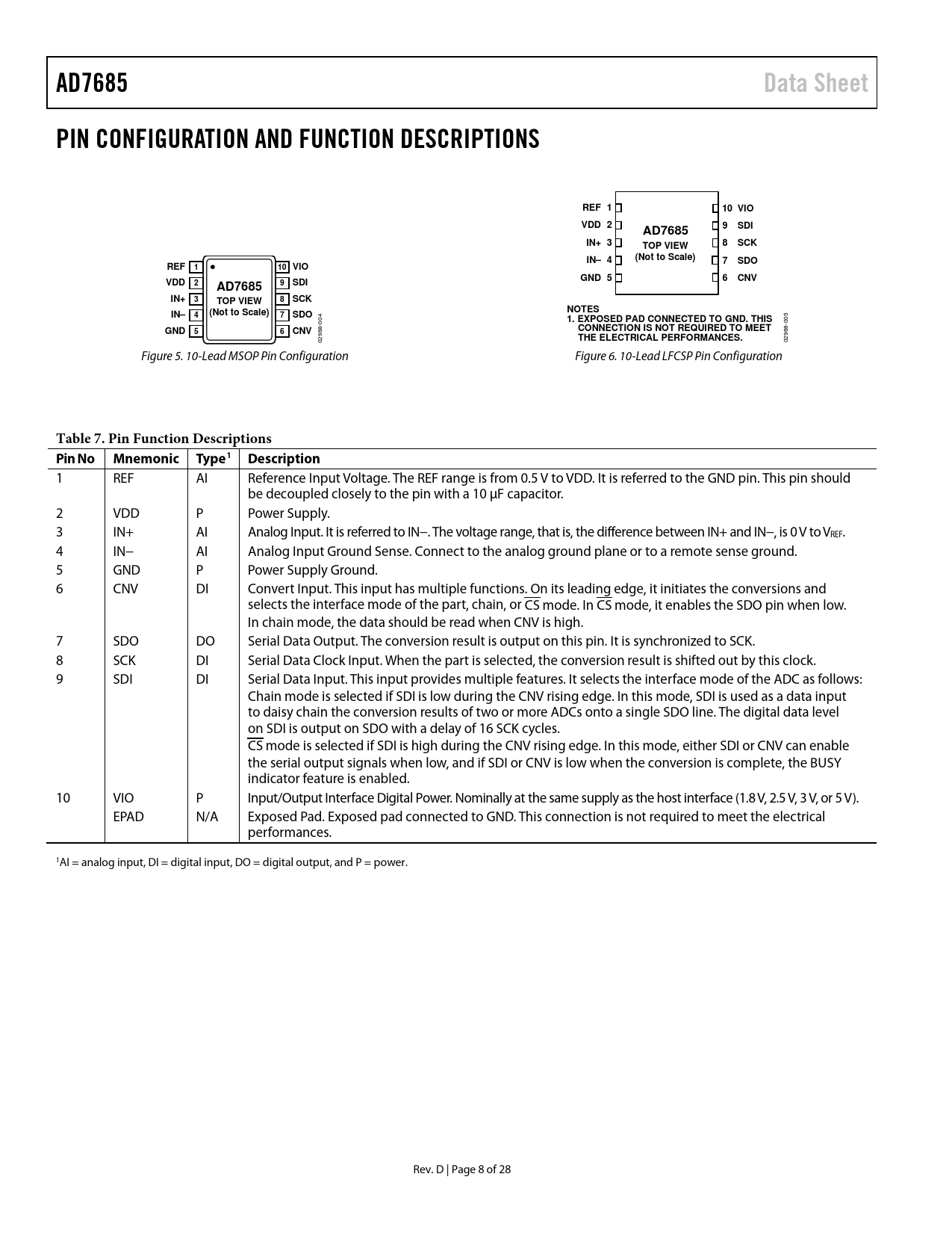 AD7685 Data Sheet PIN CONFIGURATION AND FUNCTION DESCRIPTIONS REF 1 10 VIO VDD 2 9 SDI AD7685 IN+ 3 8 SCK TOP VIEW IN– 4 (Not to Scale) 7 SDO REF 1 10 VIO GND 5 6 CNV VDD 2 9 SDI AD7685 IN+ 3 8 SCK TOP VIEW NOTES IN– 4 (Not to Scale) 7 SDO