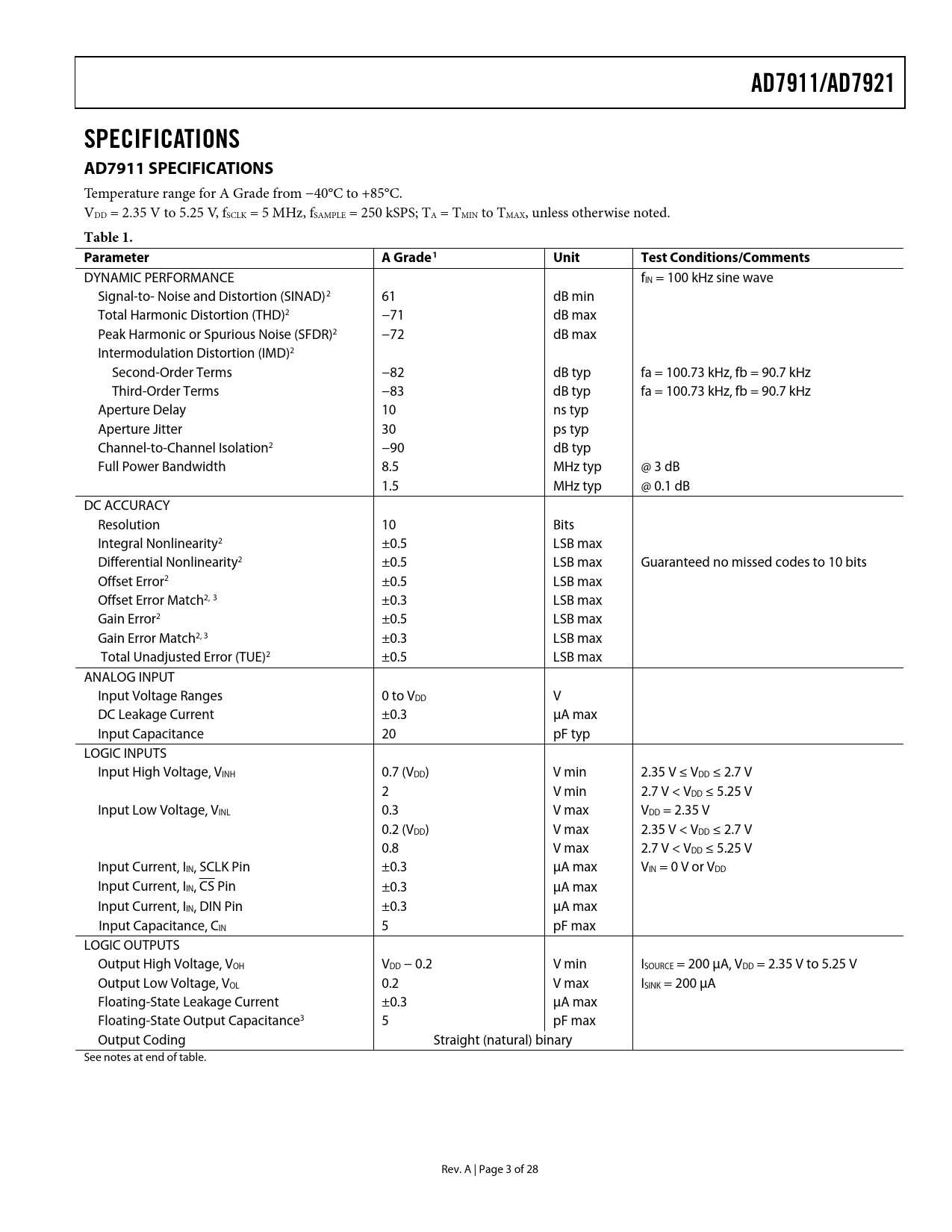 AD7911/AD7921 SPECIFICATIONS AD7911 SPECIFICATIONS Table 1 Parameter A Grade1 Unit Test Conditions/Comments