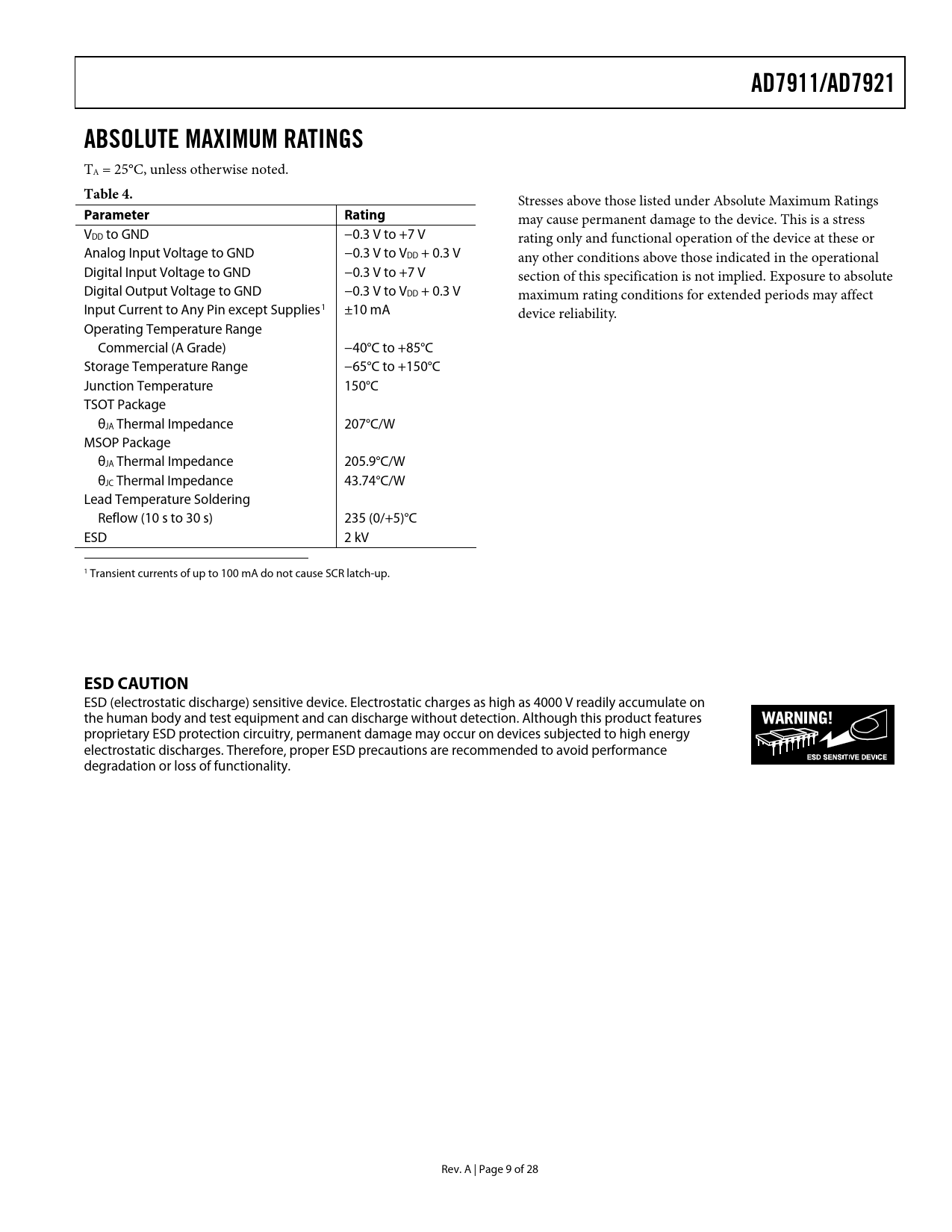 AD7911/AD7921 ABSOLUTE MAXIMUM RATINGS Table 4 Parameter Rating ESD CAUTION