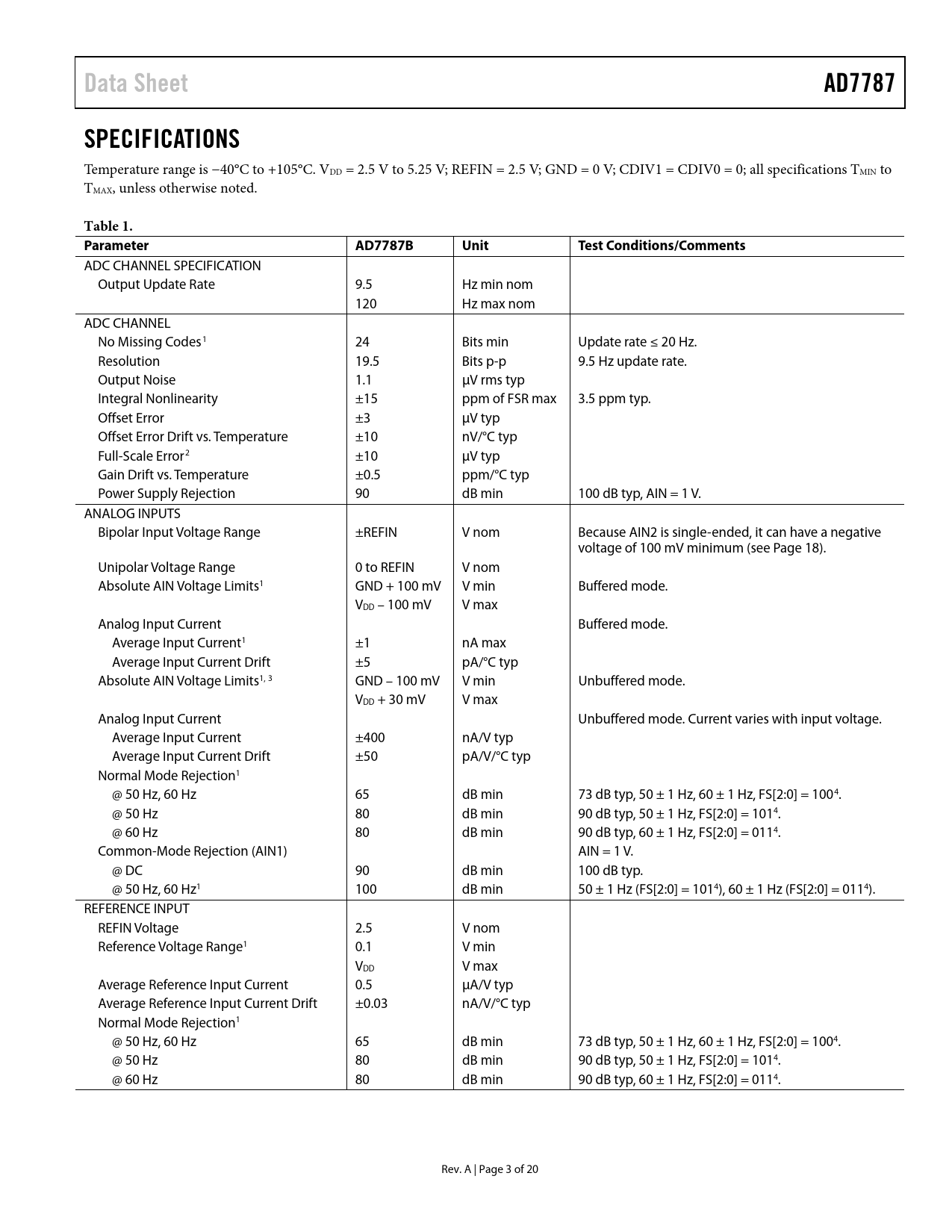 link to page 19 link to page 5 link to page 5 link to page 5 link to page 5 link to page 5 link to page 5 link to page 5 link to page 5 link to page 5 link to page 5 link to page 5 link to page 5 link to page 5 link to page 5 link to page 5 link to page 5 link to page 5 Data SheetAD7787SPECIFICATIONS Temperature range is −40°C to +105°C. VDD = 2.5 V to 5.25 V; REFIN = 2.5 V; GND = 0 V; CDIV1 = CDIV0 = 0; all specifications TMIN to TMAX, unless otherwise noted. Table 1. ParameterAD7787BUnitTest Conditions/Comments ADC CHANNEL SPECIFICATION Output Update Rate 9.5 Hz min nom 120 Hz max nom ADC CHANNEL No Missing Codes1 24 Bits min Update rate ≤ 20 Hz. Resolution 19.5 Bits p-p 9.5 Hz update rate. Output Noise 1.1 µV rms typ Integral Nonlinearity ±15 ppm of FSR max 3.5 ppm typ. Offset Error ±3 µV typ Offset Error Drift vs. Temperature ±10 nV/°C typ Full-Scale Error2 ±10 µV typ Gain Drift vs. Temperature ±0.5 ppm/°C typ Power Supply Rejection 90 dB min 100 dB typ, AIN = 1 V. ANALOG INPUTS Bipolar Input Voltage Range ±REFIN V nom Because AIN2 is single-ended, it can have a negative voltage of 100 mV minimum (see Page 18). Unipolar Voltage Range 0 to REFIN V nom Absolute AIN Voltage Limits1 GND + 100 mV V min Buffered mode. VDD – 100 mV V max Analog Input Current Buffered mode. Average Input Current1 ±1 nA max Average Input Current Drift ±5 pA/°C typ Absolute AIN Voltage Limits1, 3 GND – 100 mV V min Unbuffered mode. VDD + 30 mV V max Analog Input Current Unbuffered mode. Current varies with input voltage. Average Input Current ±400 nA/V typ Average Input Current Drift ±50 pA/V/°C typ Normal Mode Rejection1 @ 50 Hz, 60 Hz 65 dB min 73 dB typ, 50 ± 1 Hz, 60 ± 1 Hz, FS[2:0] = 1004. @ 50 Hz 80 dB min 90 dB typ, 50 ± 1 Hz, FS[2:0] = 1014. @ 60 Hz 80 dB min 90 dB typ, 60 ± 1 Hz, FS[2:0] = 0114. Common-Mode Rejection (AIN1) AIN = 1 V. @ DC 90 dB min 100 dB typ. @ 50 Hz, 60 Hz1 100 dB min 50 ± 1 Hz (FS[2:0] = 1014), 60 ± 1 Hz (FS[2:0] = 0114). REFERENCE INPUT REFIN Voltage 2.5 V nom Reference Voltage Range1 0.1 V min VDD V max Average Reference Input Current 0.5 µA/V typ Average Reference Input Current Drift ±0.03 nA/V/°C typ Normal Mode Rejection1 @ 50 Hz, 60 Hz 65 dB min 73 dB typ, 50 ± 1 Hz, 60 ± 1 Hz, FS[2:0] = 1004. @ 50 Hz 80 dB min 90 dB typ, 50 ± 1 Hz, FS[2:0] = 1014. @ 60 Hz 80 dB min 90 dB typ, 60 ± 1 Hz, FS[2:0] = 0114. Rev. A | Page 3 of 20 Document Outline Specifications Timing Characteristics Absolute Maximum Ratings ESD Caution Pin Configuration and Function Descriptions Typical Performance Characteristics On-Chip Registers Communications Register (RS1, RS0 = 0, 0) Status Register (RS1, RS0 = 0, 0; Power-On/Reset = 0×8C) Mode Register (RS1, RS0 = 0, 1; Power-On/Reset = 0×02) Filter Register (RS1, RS0 = 1, 0; Power-On/Reset = 0×04) Data Register (RS1, RS0 = 1, 1; Power-On/Reset = 0×000000) ADC Circuit Information Overview Noise Performance Reduced Current Modes Digital Interface Single Conversion Mode Continuous Conversion Mode Continuous Read Mode Circuit Description Analog Input Channel Bipolar/Unipolar Configuration Data Output Coding Reference Input VDD Monitor Grounding and Layout Applications Battery Monitoring Outline Dimensions Ordering Guide
