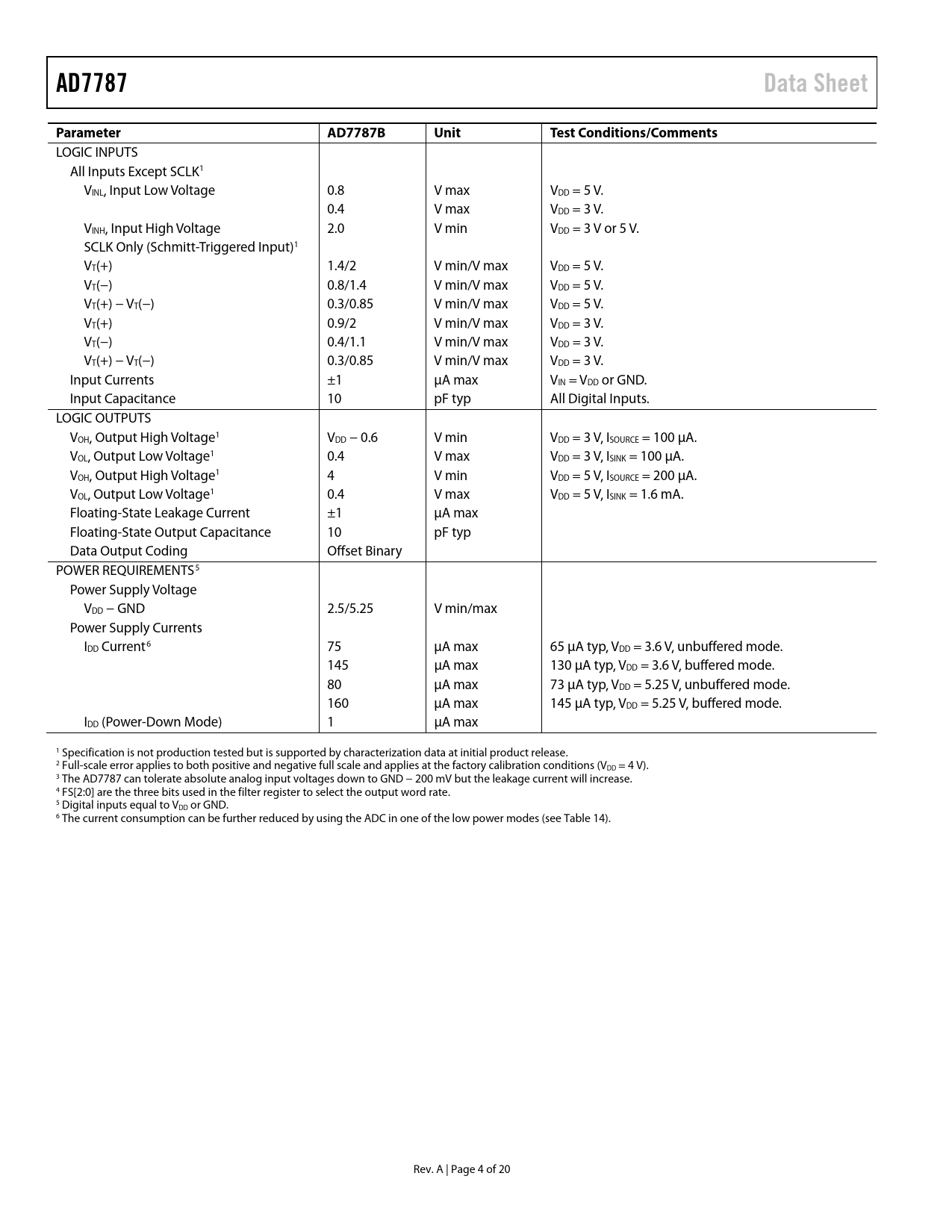 Páginas / Página21 / 5 — AD7787. Data Sheet. Parameter. AD7787B. Unit. Test Conditions/Comments