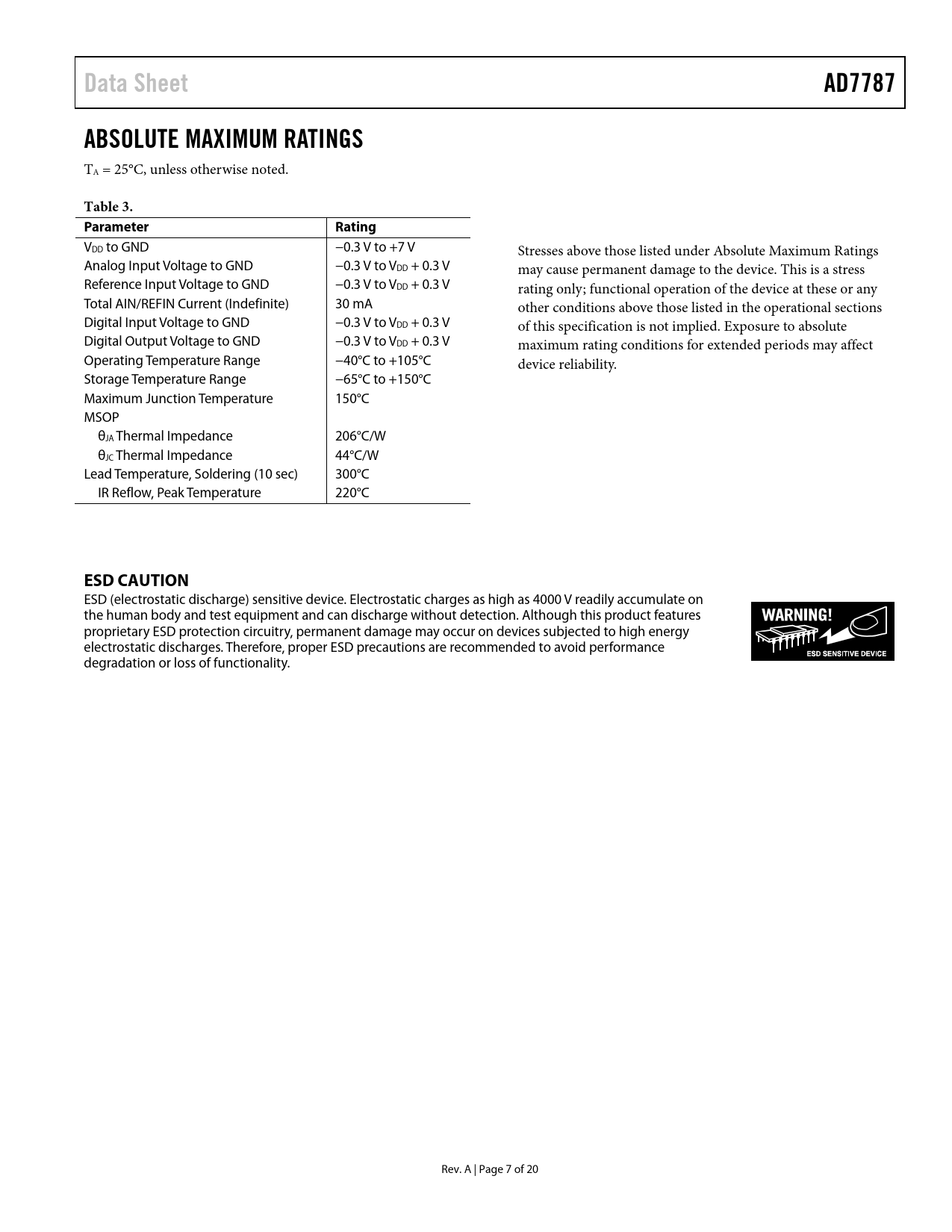 Data Sheet AD7787 ABSOLUTE MAXIMUM RATINGS Table 3 Parameter Rating ESD CAUTION