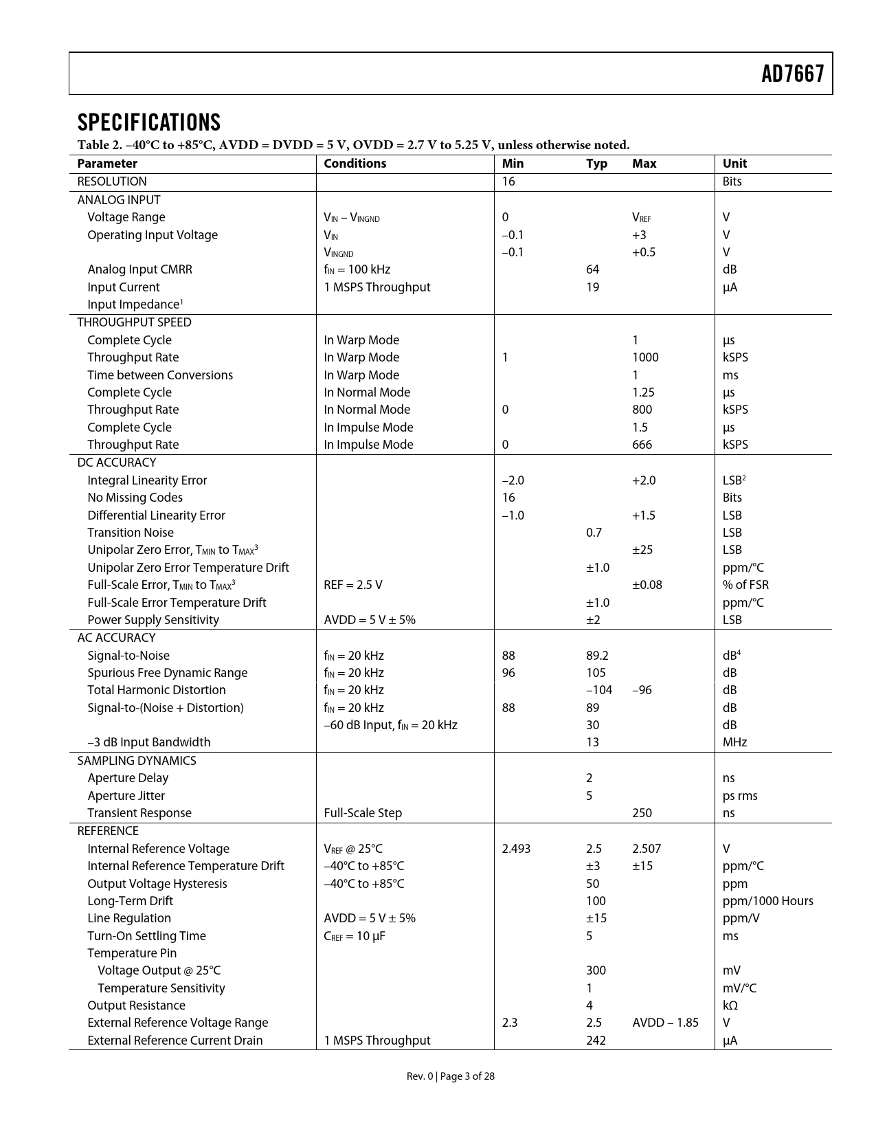 link to page 4 link to page 5 link to page 5 link to page 5 link to page 5 AD7667SPECIFICATIONS Table 2. –40°C to +85°C, AVDD = DVDD = 5 V, OVDD = 2.7 V to 5.25 V, unless otherwise noted. Parameter ConditionsMinTypMaxUnit RESOLUTION 16 Bits ANALOG INPUT Voltage Range VIN – VINGND 0 VREF V Operating Input Voltage VIN –0.1 +3 V VINGND –0.1 +0.5 V Analog Input CMRR fIN = 100 kHz 64 dB Input Current 1 MSPS Throughput 19 µA Input Impedance1 THROUGHPUT SPEED Complete Cycle In Warp Mode 1 µs Throughput Rate In Warp Mode 1 1000 kSPS Time between Conversions In Warp Mode 1 ms Complete Cycle In Normal Mode 1.25 µs Throughput Rate In Normal Mode 0 800 kSPS Complete Cycle In Impulse Mode 1.5 µs Throughput Rate In Impulse Mode 0 666 kSPS DC ACCURACY Integral Linearity Error –2.0 +2.0 LSB2 No Missing Codes 16 Bits Differential Linearity Error –1.0 +1.5 LSB Transition Noise 0.7 LSB Unipolar Zero Error, T 3 MIN to TMAX ±25 LSB Unipolar Zero Error Temperature Drift ±1.0 ppm/°C Full-Scale Error, T 3 MIN to TMAX REF = 2.5 V ±0.08 % of FSR Full-Scale Error Temperature Drift ±1.0 ppm/°C Power Supply Sensitivity AVDD = 5 V ± 5% ±2 LSB AC ACCURACY Signal-to-Noise fIN = 20 kHz 88 89.2 dB4 Spurious Free Dynamic Range fIN = 20 kHz 96 105 dB Total Harmonic Distortion fIN = 20 kHz –104 –96 dB Signal-to-(Noise + Distortion) fIN = 20 kHz 88 89 dB –60 dB Input, fIN = 20 kHz 30 dB –3 dB Input Bandwidth 13 MHz SAMPLING DYNAMICS Aperture Delay 2 ns Aperture Jitter 5 ps rms Transient Response Full-Scale Step 250 ns REFERENCE Internal Reference Voltage VREF @ 25°C 2.493 2.5 2.507 V Internal Reference Temperature Drift –40°C to +85°C ±3 ±15 ppm/°C Output Voltage Hysteresis –40°C to +85°C 50 ppm Long-Term Drift 100 ppm/1000 Hours Line Regulation AVDD = 5 V ± 5% ±15 ppm/V Turn-On Settling Time CREF = 10 µF 5 ms Temperature Pin Voltage Output @ 25°C 300 mV Temperature Sensitivity 1 mV/°C Output Resistance 4 kΩ External Reference Voltage Range 2.3 2.5 AVDD – 1.85 V External Reference Current Drain 1 MSPS Throughput 242 µA Rev. 0 | Page 3 of 28 Document Outline FEATURES APPLICATIONS GENERAL DESCRIPTION FUNCTIONAL BLOCK DIAGRAM PRODUCT HIGHLIGHTS SPECIFICATIONS TIMING SPECIFICATIONS ABSOLUTE MAXIMUM RATINGS ESD CAUTION PIN CONFIGURATION AND FUNCTION DESCRIPTIONS DEFINITIONS OF SPECIFICATIONS TYPICAL PERFORMANCE CHARACTERISTICS CIRCUIT INFORMATION CONVERTER OPERATION Modes Of Operation Transfer Functions TYPICAL CONNECTION DIAGRAM Analog Input Driver Amplifier Choice Voltage Reference Input Power Supply POWER DISSIPATION VERSUS THROUGHPUT CONVERSION CONTROL DIGITAL INTERFACE PARALLEL INTERFACE SERIAL INTERFACE MASTER SERIAL INTERFACE Internal Clock SLAVE SERIAL INTERFACE External Clock External Discontinuous Clock Data Read After Conversion External Clock Data Read During Conversion MICROPROCESSOR INTERFACING SPI Interface (ADSP-219x) APPLICATION HINTS BIPOLAR AND WIDER INPUT RANGES LAYOUT EVALUATING THE AD7667’S PERFORMANCE OUTLINE DIMENSIONS ORDERING GUIDE