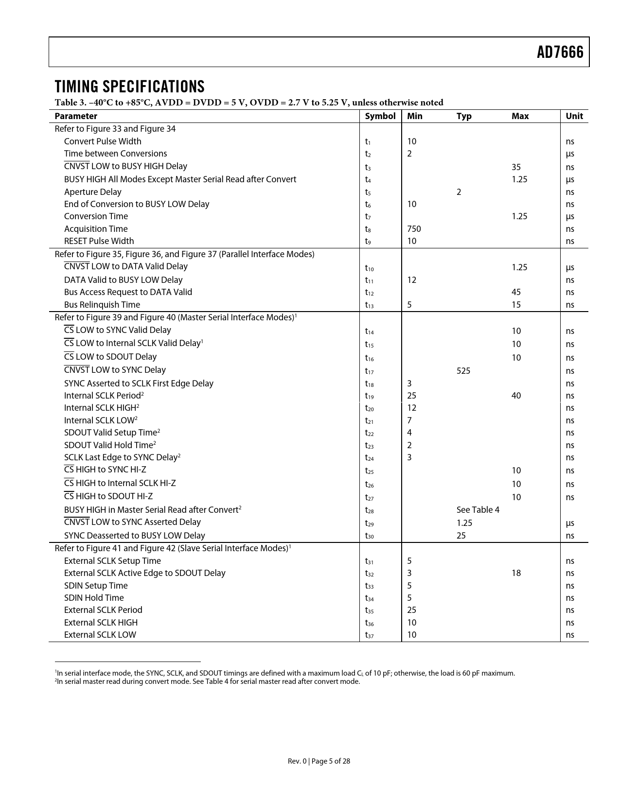 AD7666 TIMING SPECIFICATIONS Table 3. –40°C to +85°C, AVDD = DVDD = 5 V, OVDD = 2.7 V to 5.25 V, unless otherwise noted Parameter Symbol Min Typ Max Unit