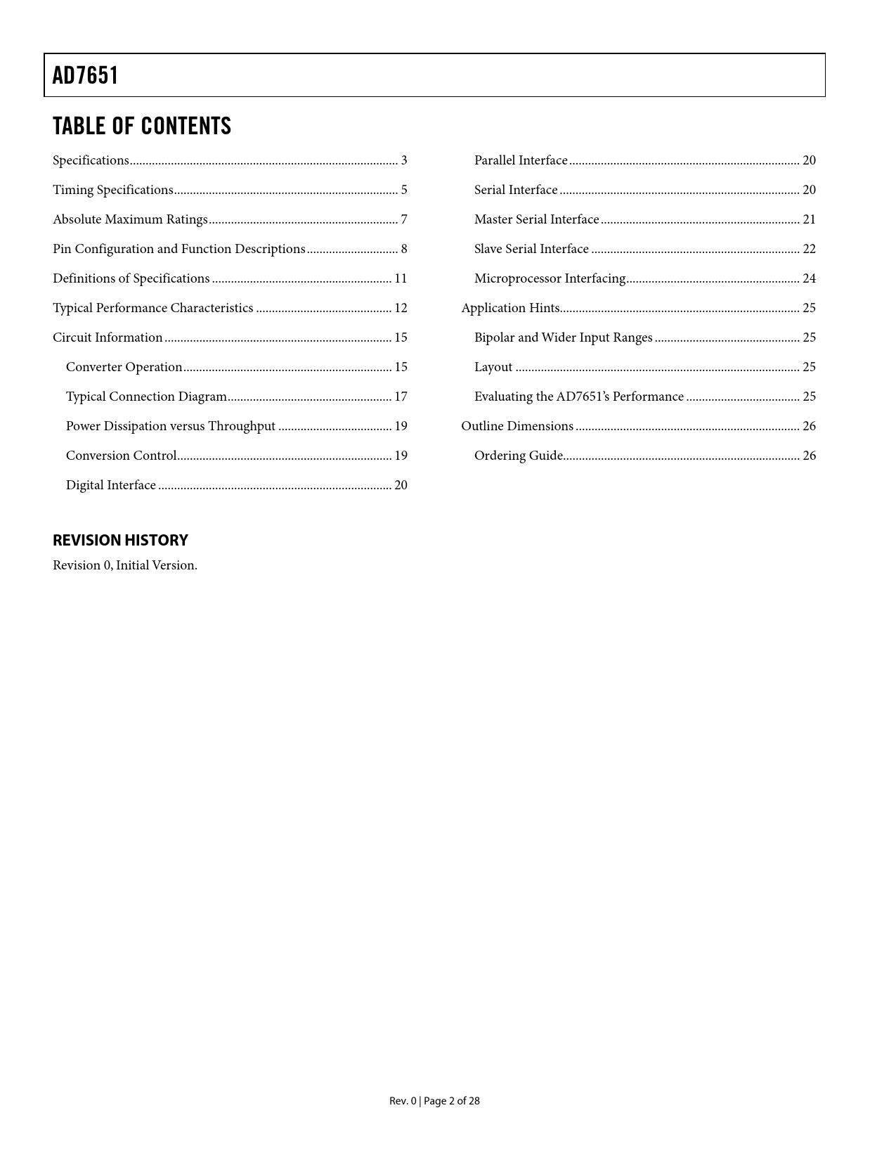 Revision 0, Initial Version. Rev. 0 | Page 2 of 28 Document Outline FEATURES APPLICATIONS GENERAL DESCRIPTION FUNCTIONAL BLOCK DIAGRAM PRODUCT HIGHLIGHTS SPECIFICATIONS TIMING SPECIFICATIONS ABSOLUTE MAXIMUM RATINGS PIN CONFIGURATION AND FUNCTION DESCRIPTIONS DEFINITIONS OF SPECIFICATIONS TYPICAL PERFORMANCE CHARACTERISTICS CIRCUIT INFORMATION CONVERTER OPERATION TYPICAL CONNECTION DIAGRAM POWER DISSIPATION VERSUS THROUGHPUT CONVERSION CONTROL DIGITAL INTERFACE PARALLEL INTERFACE SERIAL INTERFACE MASTER SERIAL INTERFACE SLAVE SERIAL INTERFACE MICROPROCESSOR INTERFACING APPLICATION HINTS BIPOLAR AND WIDER INPUT RANGES LAYOUT EVALUATING THE AD7651’S PERFORMANCE OUTLINE DIMENSIONS ORDERING GUIDE