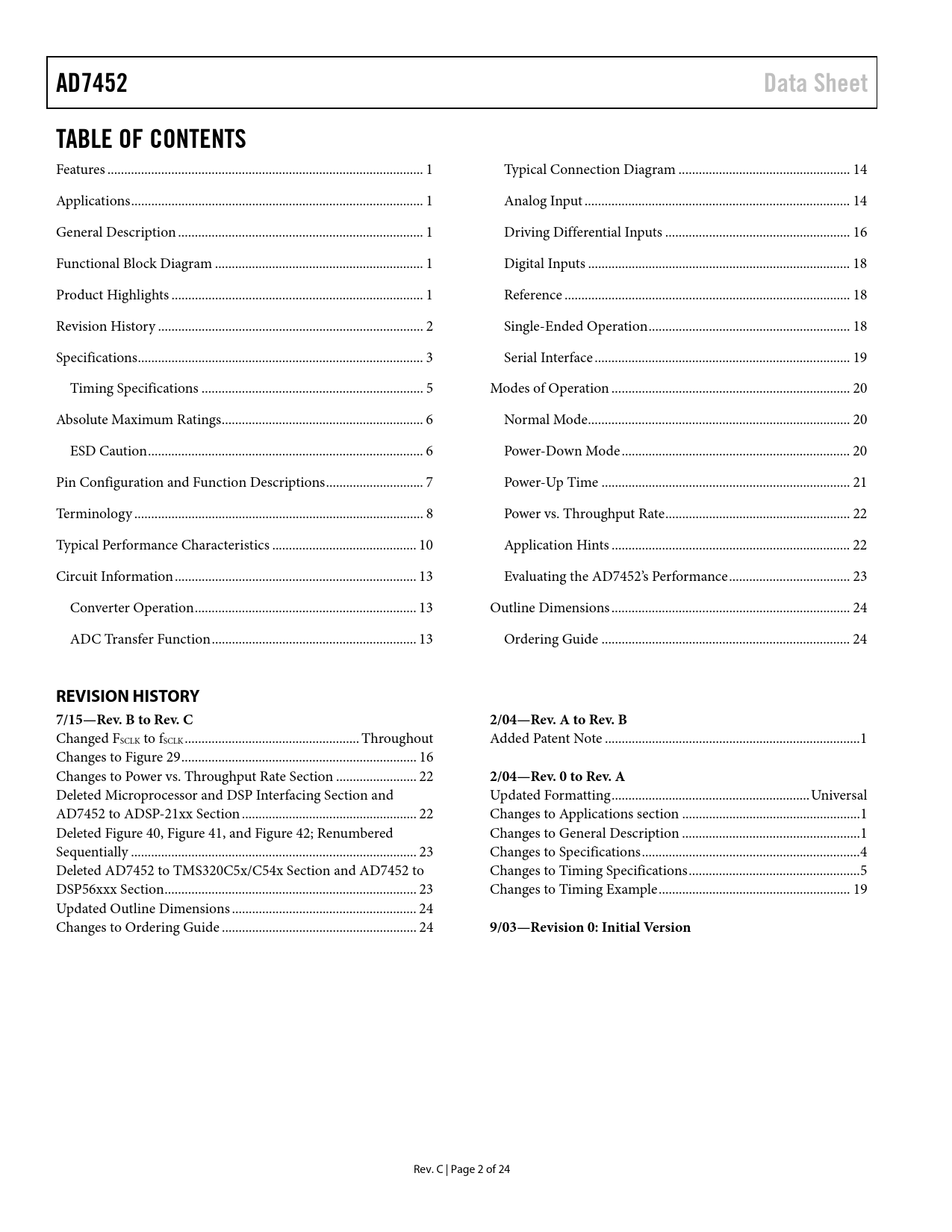 AD7452 Data Sheet TABLE OF CONTENTS REVISION HISTORY 7/15—Rev B to Rev C 2/04—Rev A to Rev B 2/04—Rev 0 to Rev A