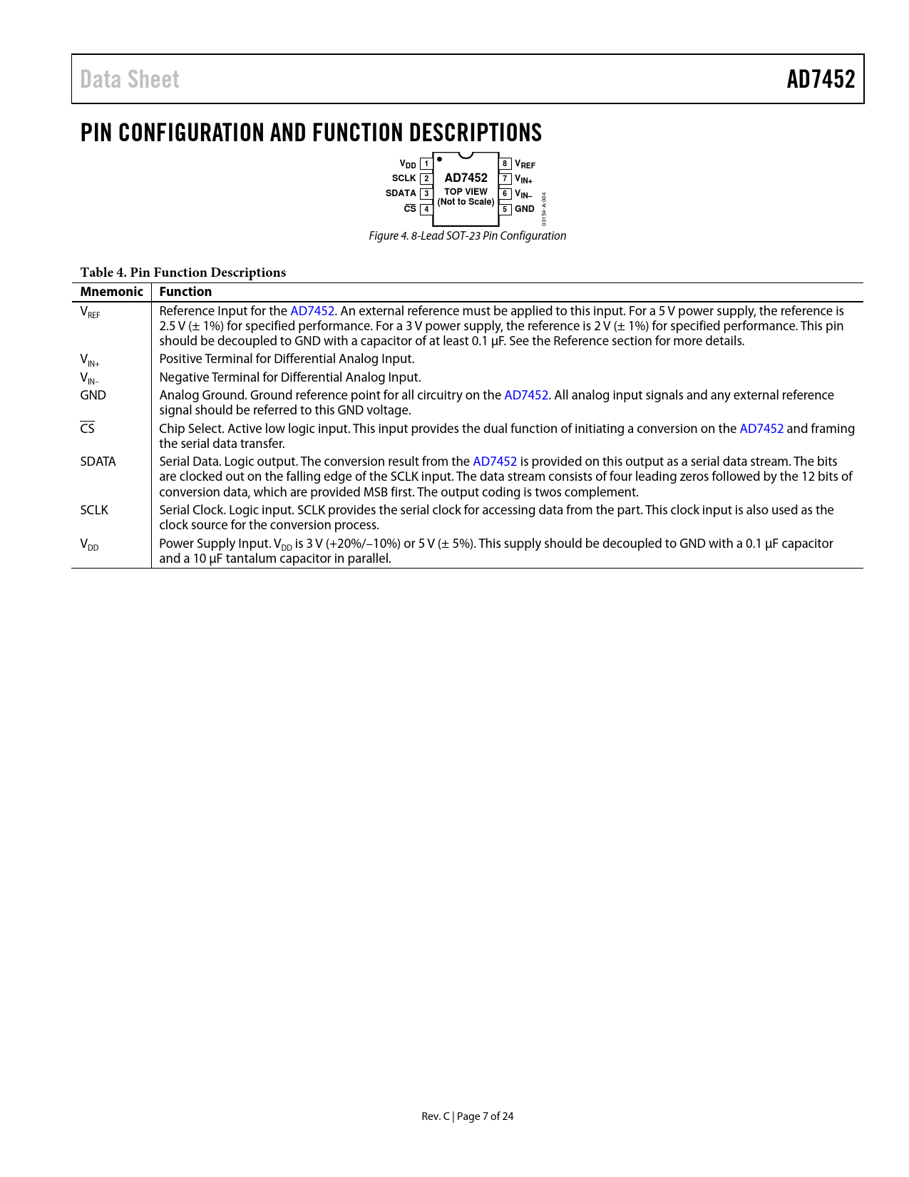 Data Sheet AD7452 PIN CONFIGURATION AND FUNCTION DESCRIPTIONS VDD 1 VREF SCLK VIN+ SDATA TOP VIEW VIN– (Not to Scale) GND