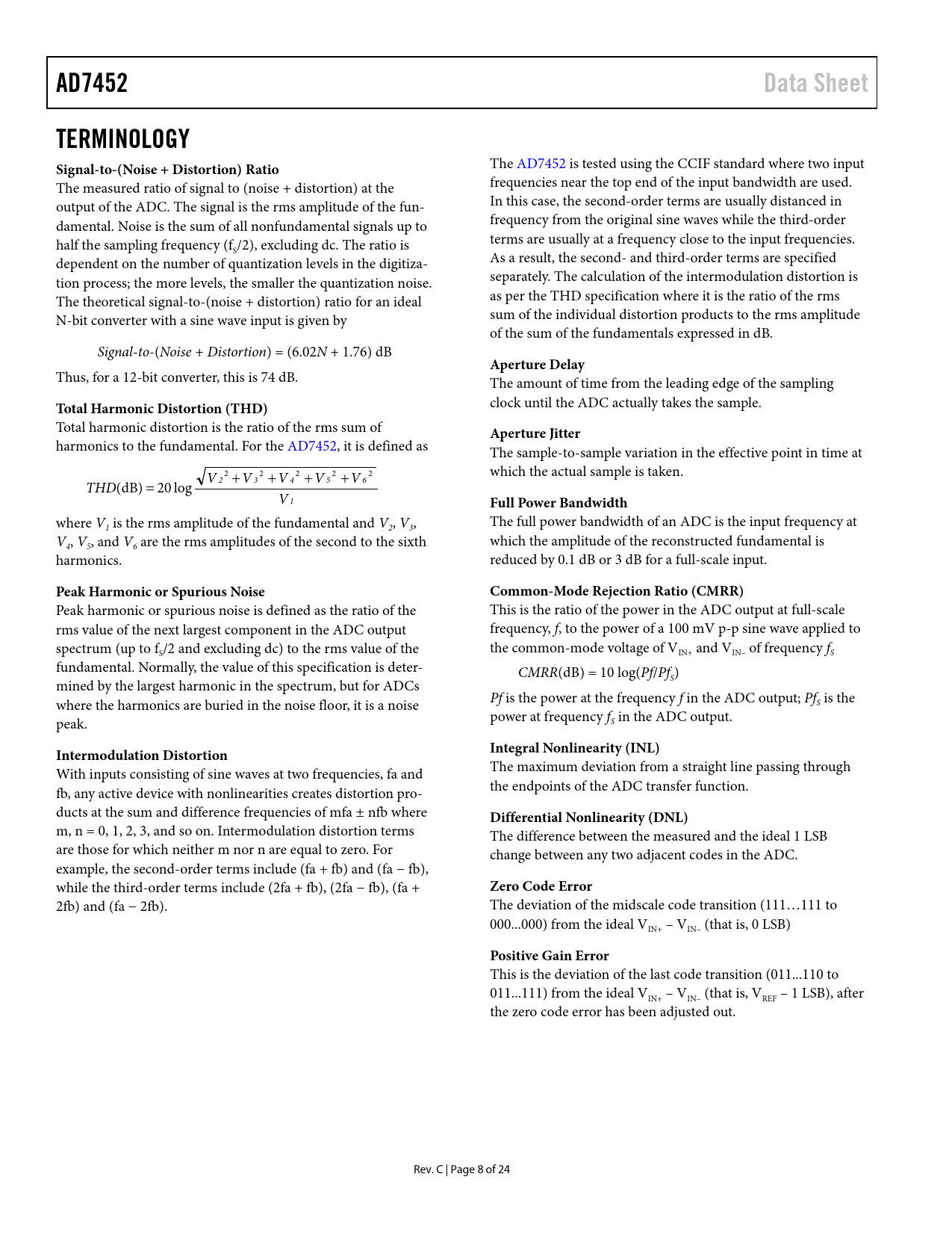 AD7452Data SheetTERMINOLOGY Signal-to-(Noise + Distortion) Ratio The AD7452 is tested using the CCIF standard where two input The measured ratio of signal to (noise + distortion) at the frequencies near the top end of the input bandwidth are used. output of the ADC. The signal is the rms amplitude of the fun- In this case, the second-order terms are usually distanced in damental. Noise is the sum of all nonfundamental signals up to frequency from the original sine waves while the third-order half the sampling frequency (f terms are usual y at a frequency close to the input frequencies. S/2), excluding dc. The ratio is dependent on the number of quantization levels in the digitiza- As a result, the second- and third-order terms are specified tion process; the more levels, the smaller the quantization noise. separately. The calculation of the intermodulation distortion is The theoretical signal-to-(noise + distortion) ratio for an ideal as per the THD specification where it is the ratio of the rms N-bit converter with a sine wave input is given by sum of the individual distortion products to the rms amplitude of the sum of the fundamentals expressed in dB. Signal-to-(Noise + Distortion) = (6.02N + 1.76) dB Aperture Delay Thus, for a 12-bit converter, this is 74 dB. The amount of time from the leading edge of the sampling Total Harmonic Distortion (THD) clock until the ADC actually takes the sample. Total harmonic distortion is the ratio of the rms sum of Aperture Jitter harmonics to the fundamental. For the AD7452, it is defined as The sample-to-sample variation in the effective point in time at V 2 2 2 2 2 which the actual sample is taken. 2 + V 3 + V 4 + V 5 + V 6 THD ) dB ( = 20 log V1 Full Power Bandwidth where V The ful power bandwidth of an ADC is the input frequency at 1 is the rms amplitude of the fundamental and V2, V3, V which the amplitude of the reconstructed fundamental is 4, V5, and V6 are the rms amplitudes of the second to the sixth harmonics. reduced by 0.1 dB or 3 dB for a full-scale input. Peak Harmonic or Spurious NoiseCommon-Mode Rejection Ratio (CMRR) Peak harmonic or spurious noise is defined as the ratio of the This is the ratio of the power in the ADC output at ful -scale rms value of the next largest component in the ADC output frequency, f, to the power of a 100 mV p-p sine wave applied to spectrum (up to f the common-mode voltage of V S/2 and excluding dc) to the rms value of the IN+ and VIN– of frequency fS fundamental. Normally, the value of this specification is deter- CMRR(dB) = 10 log(Pf/Pf mined by the largest harmonic in the spectrum, but for ADCs S) where the harmonics are buried in the noise floor, it is a noise Pf is the power at the frequency f in the ADC output; PfS is the peak. power at frequency fS in the ADC output. Intermodulation DistortionIntegral Nonlinearity (INL) With inputs consisting of sine waves at two frequencies, fa and The maximum deviation from a straight line passing through fb, any active device with nonlinearities creates distortion pro- the endpoints of the ADC transfer function. ducts at the sum and difference frequencies of mfa ± nfb where Differential Nonlinearity (DNL) m, n = 0, 1, 2, 3, and so on. Intermodulation distortion terms The difference between the measured and the ideal 1 LSB are those for which neither m nor n are equal to zero. For change between any two adjacent codes in the ADC. example, the second-order terms include (fa + fb) and (fa − fb), while the third-order terms include (2fa + fb), (2fa − fb), (fa + Zero Code Error 2fb) and (fa − 2fb). The deviation of the midscale code transition (111…111 to 000.. 000) from the ideal VIN+ – VIN– (that is, 0 LSB) Positive Gain Error This is the deviation of the last code transition (011. .110 to 011.. 111) from the ideal VIN+ – VIN– (that is, VREF – 1 LSB), after the zero code error has been adjusted out. Rev. C | Page 8 of 24 Document Outline FEATURES APPLICATIONS GENERAL DESCRIPTION FUNCTIONAL BLOCK DIAGRAM PRODUCT HIGHLIGHTS TABLE OF CONTENTS REVISION HISTORY SPECIFICATIONS TIMING SPECIFICATIONS ABSOLUTE MAXIMUM RATINGS ESD CAUTION PIN CONFIGURATION AND FUNCTION DESCRIPTIONS TERMINOLOGY TYPICAL PERFORMANCE CHARACTERISTICS CIRCUIT INFORMATION CONVERTER OPERATION ADC TRANSFER FUNCTION TYPICAL CONNECTION DIAGRAM ANALOG INPUT Analog Input Structure DRIVING DIFFERENTIAL INPUTS Differential Amplifier Op Amp Pair RF Transformer DIGITAL INPUTS REFERENCE Example 1 Example 2 SINGLE-ENDED OPERATION SERIAL INTERFACE Timing Example MODES OF OPERATION NORMAL MODE POWER-DOWN MODE POWER-UP TIME POWER vs. THROUGHPUT RATE APPLICATION HINTS Grounding and Layout EVALUATING THE AD7452’S PERFORMANCE OUTLINE DIMENSIONS ORDERING GUIDE