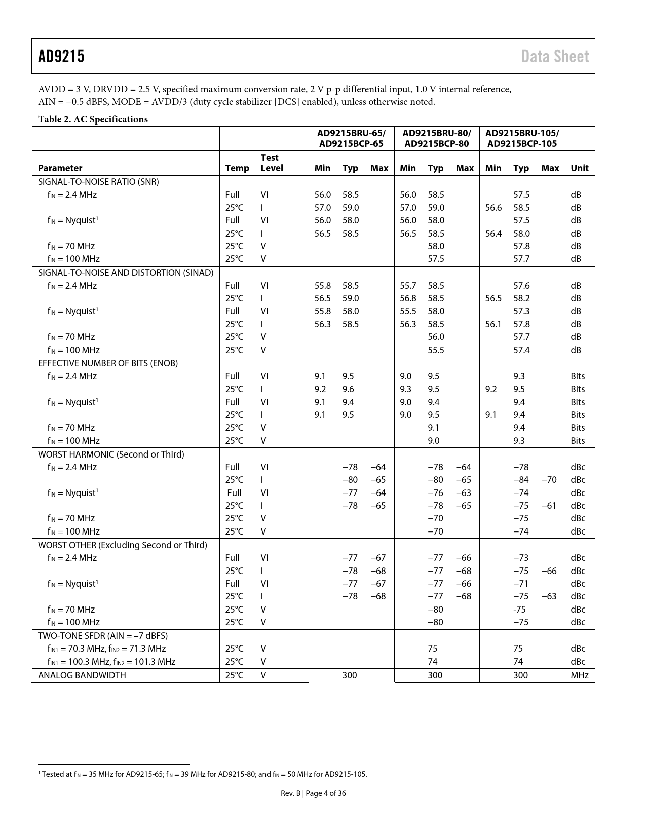 AD9215 Data Sheet Table 2 AC Specifications AD9215BRU-65/ AD9215BRU-80/ AD9215BRU-105/ AD9215BCP-65 AD9215BCP-80 AD9215BCP-105