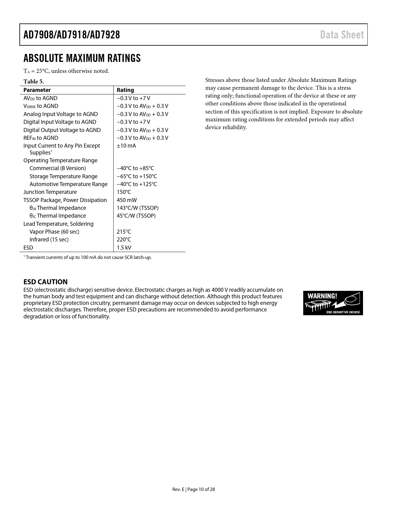 AD7908/AD7918/AD7928. Data Sheet. ABSOLUTE MAXIMUM RATINGS. Table 5. Parameter. Rating. ESD CAUTION